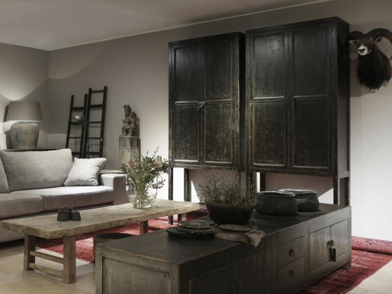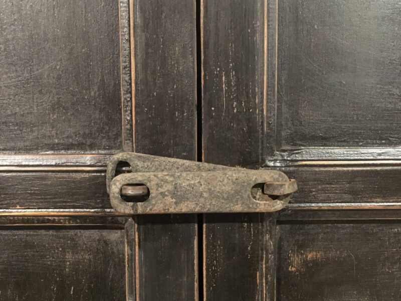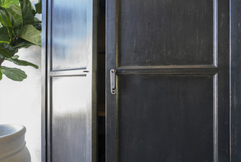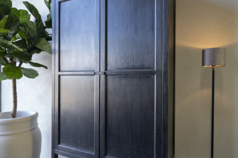 Cabinet Sam 90 CLASSIC Black is made of solid elm wood with a beautiful grain structure and a black patina. The cabinet has two panel doors, three shelves, and a shelf below.