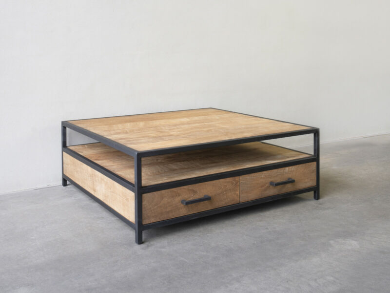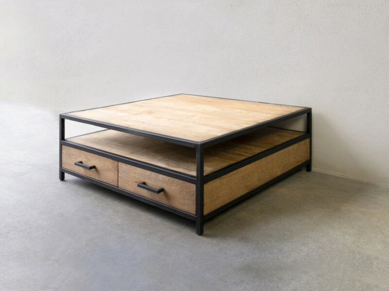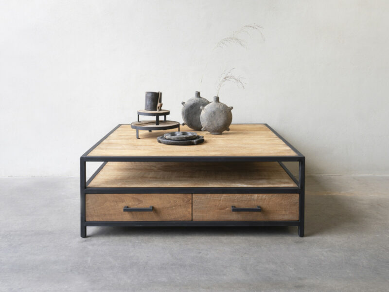 Coffee table 110 METAL is made of solid teak wood with matte black metal frames, a spacious niche and four spacious drawers.