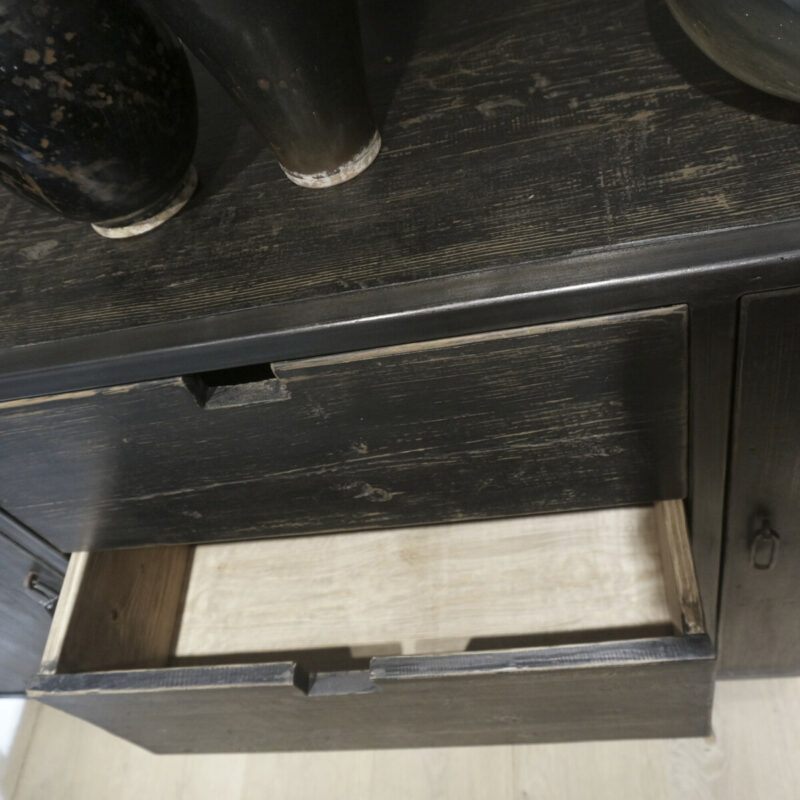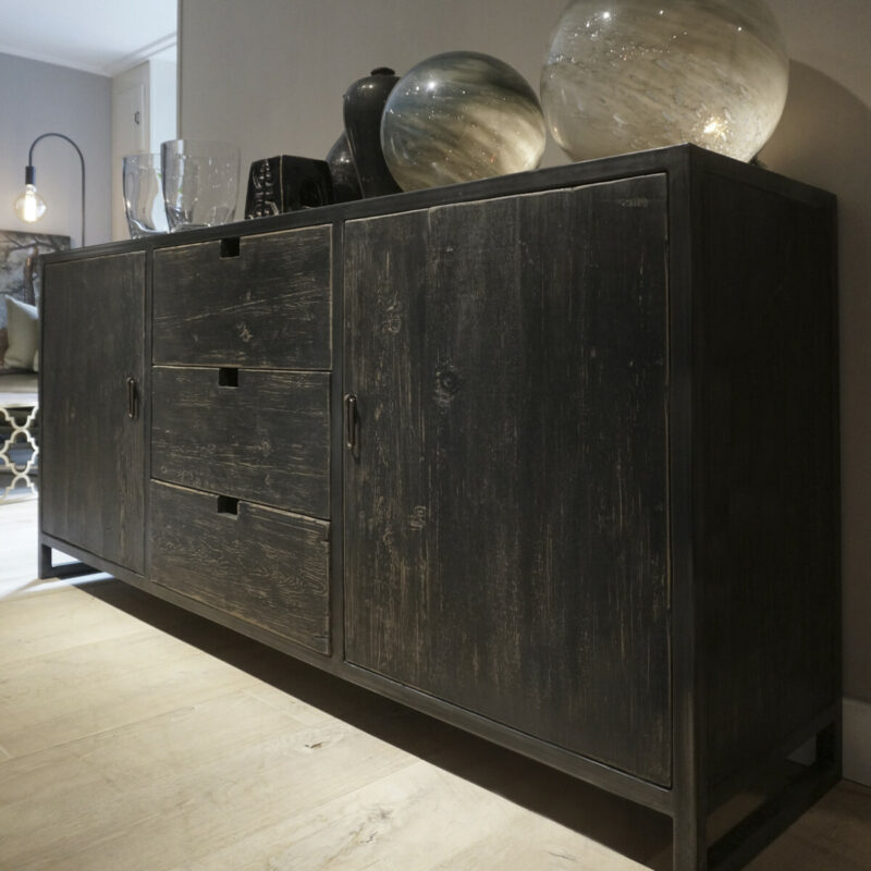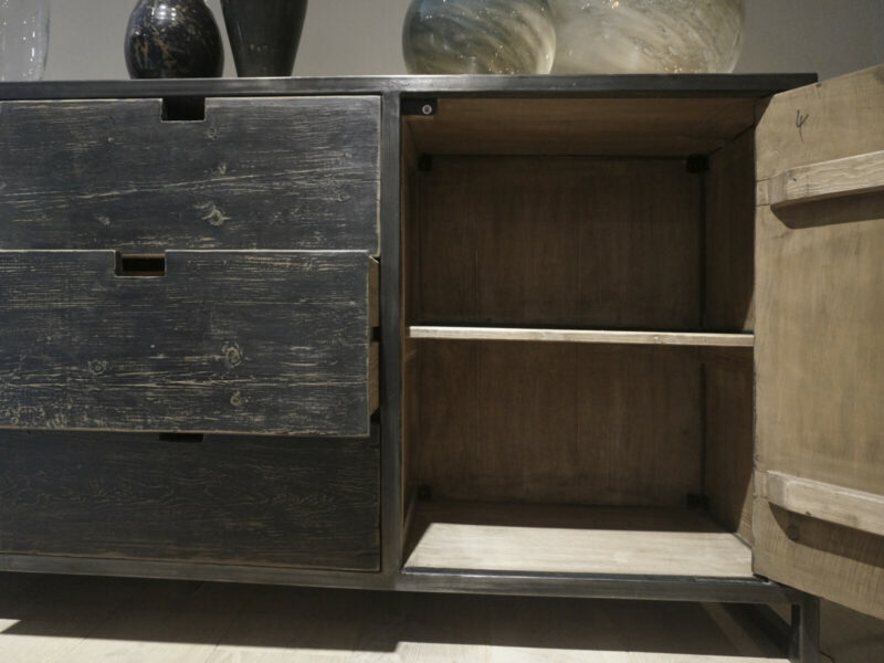 Sideboard RAW 200 Black is made of a dark metal frame and solid elm wood with a beautiful grain structure and a black patina. An unlacquered variant in natural elm wood is also available: Art. No. RCN 1004 Natural – €727