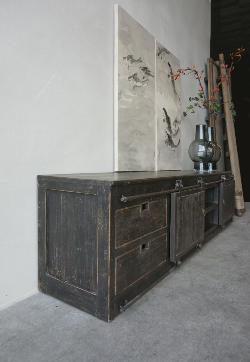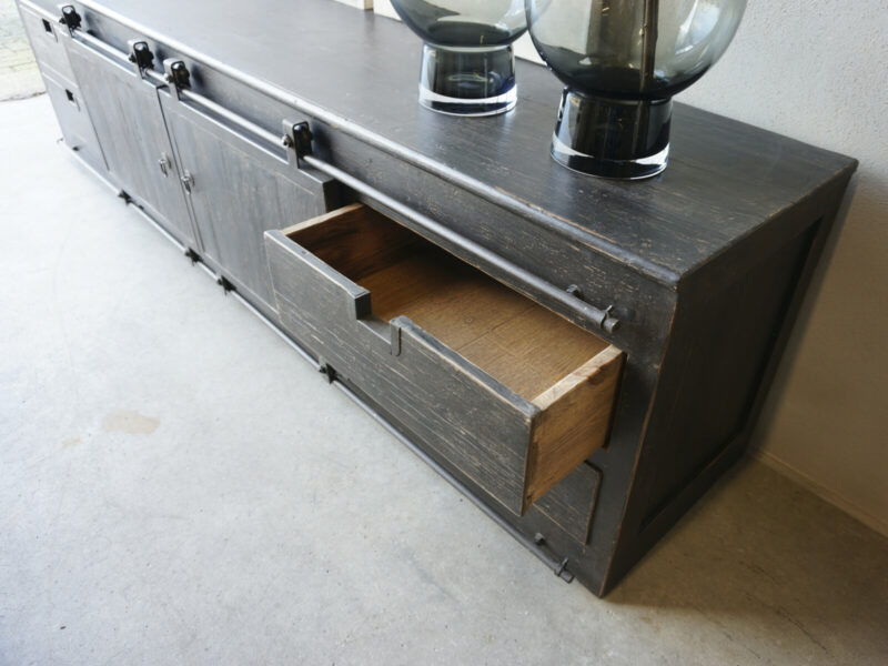 TV Sideboard BARN Olm 240 Natural is made of the robust hard wood Olm with two sliding barndoors and 4 spacious drawers. There is also a 200 cm variant