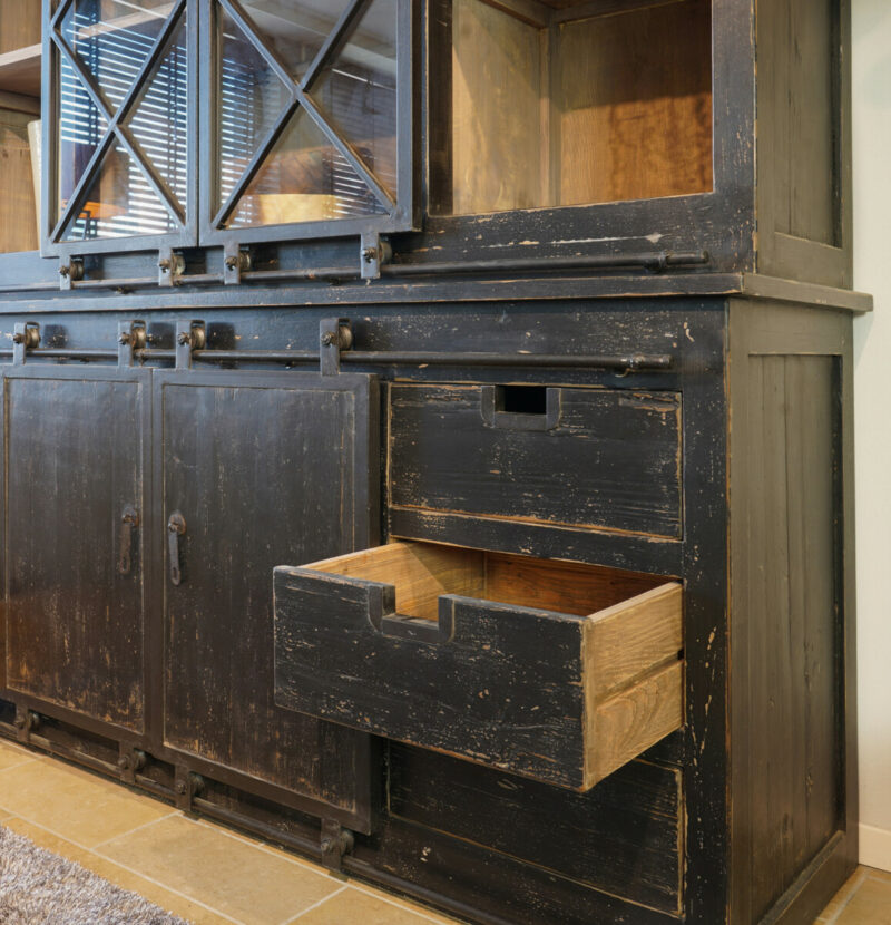 Cabinet Mark BARN 170 Black is gemaakt van Old Pinewood  met een zwarte patina, en heeft 4 metalen schuifdeuren, 6 schuiflades en 3 legplanken in de vitrine.
