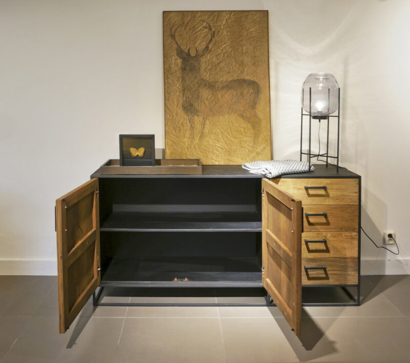 STEEL dressoir 180 is gemaakt van massief teakhout met mat zwart metalen frames, en heeft twee deuren met een legplank, en rechts vier laden.