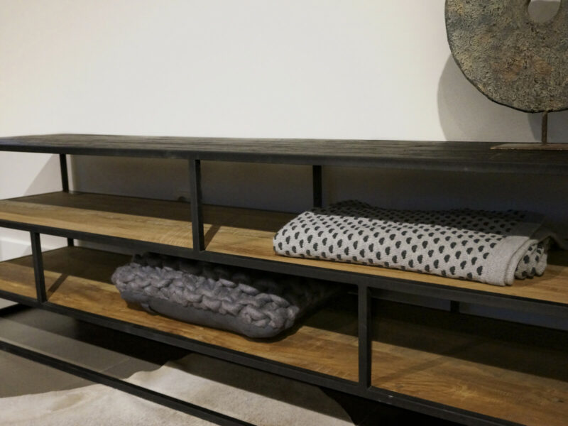 STEEL TV Meubel 200 is gemaakt van massief teakhout met mat zwart metalen frames, en heeft twee legplanken met een leuke verdeling.