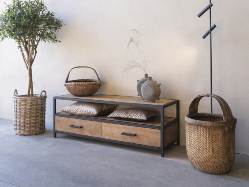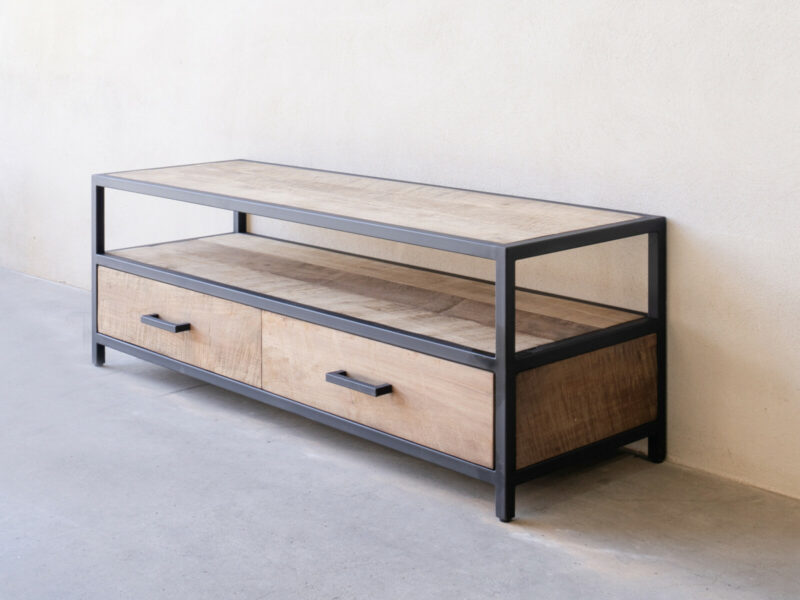 TV dressoir 130 METAL is gemaakt van massief teakhout met mat zwart metalen frames, een ruime nis, en twee ruime laden.