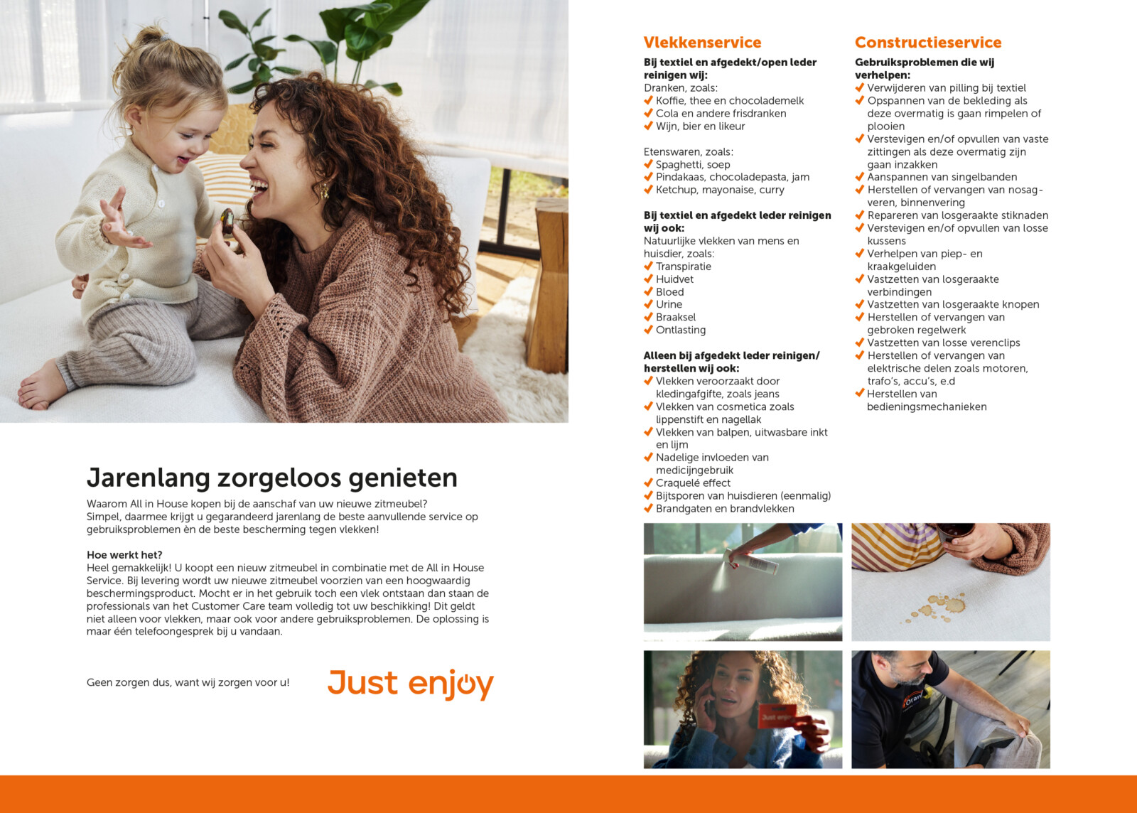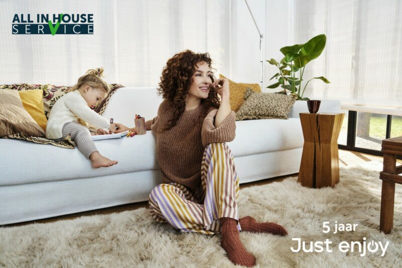 We bieden het ‘All In House’ 5 jarige service programma van Oranje Furniture Care aan op al onze gestoffeerde zitmeubelen. All In House is een unieke service om uw nieuwe meubel in topconditie te houden, en jarenlang zorgeloos te kunnen genieten van uw meubel. Niet alleen blijft uw zitmeubel door de geïmpregneerde coating veel mooier, de service biedt maar liefst vijf jaar garantie op het ontstaan van vlekken en constructieschade.