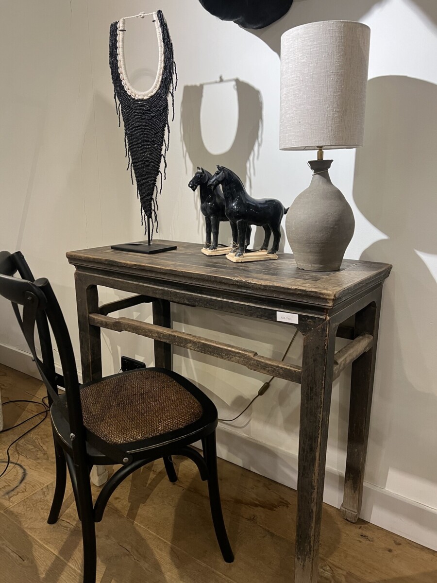 Antieke smalle wandtafel ook te gebruiken als bureautje met doorleefde warme uitstraling.