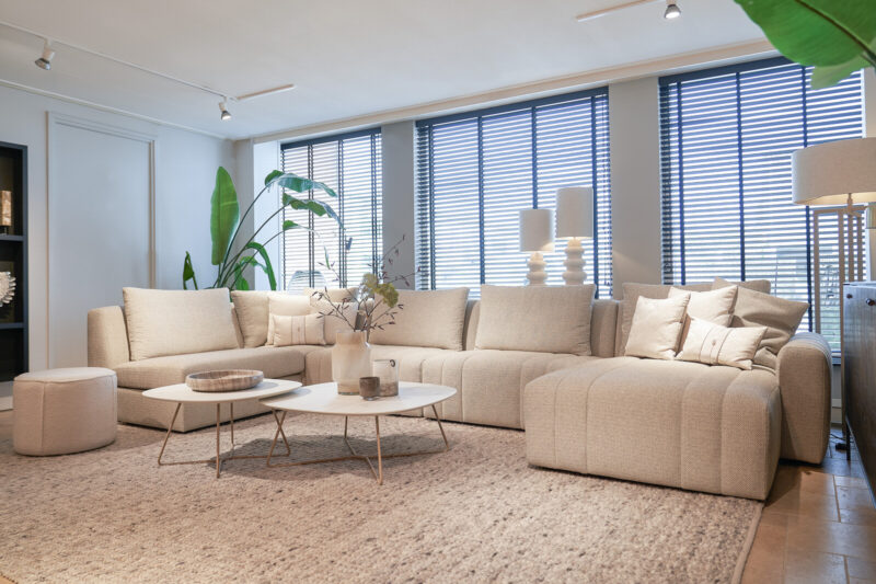In de showroom uitgevoerd in de stof LSB 2015 combi grain, kleur: egg shell, met de volgende elementen uit de reeks A en D: