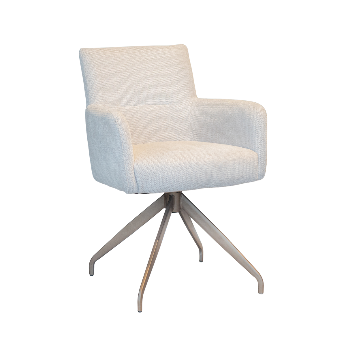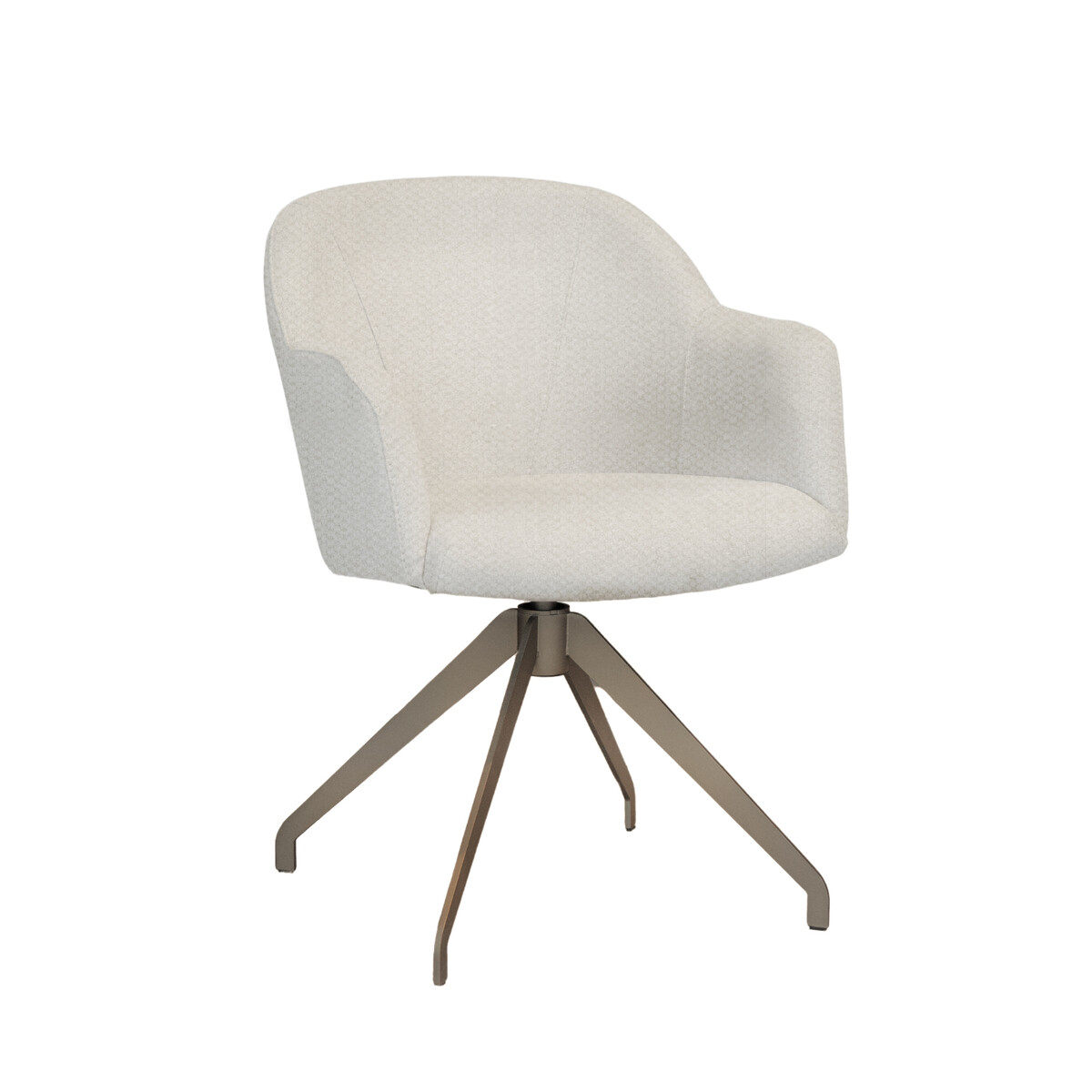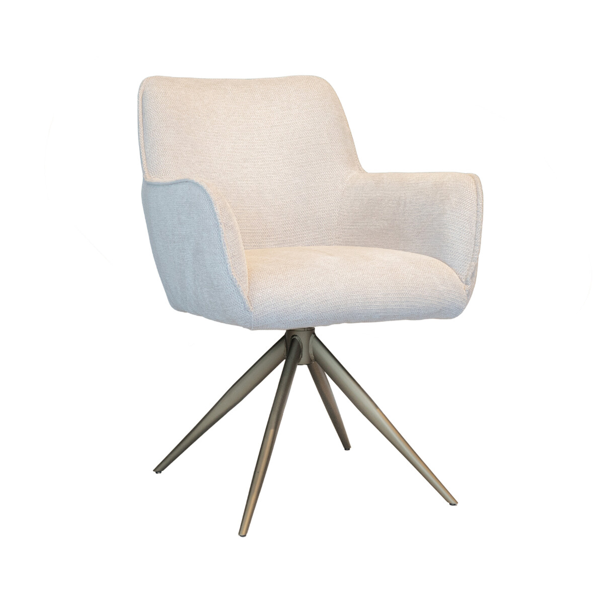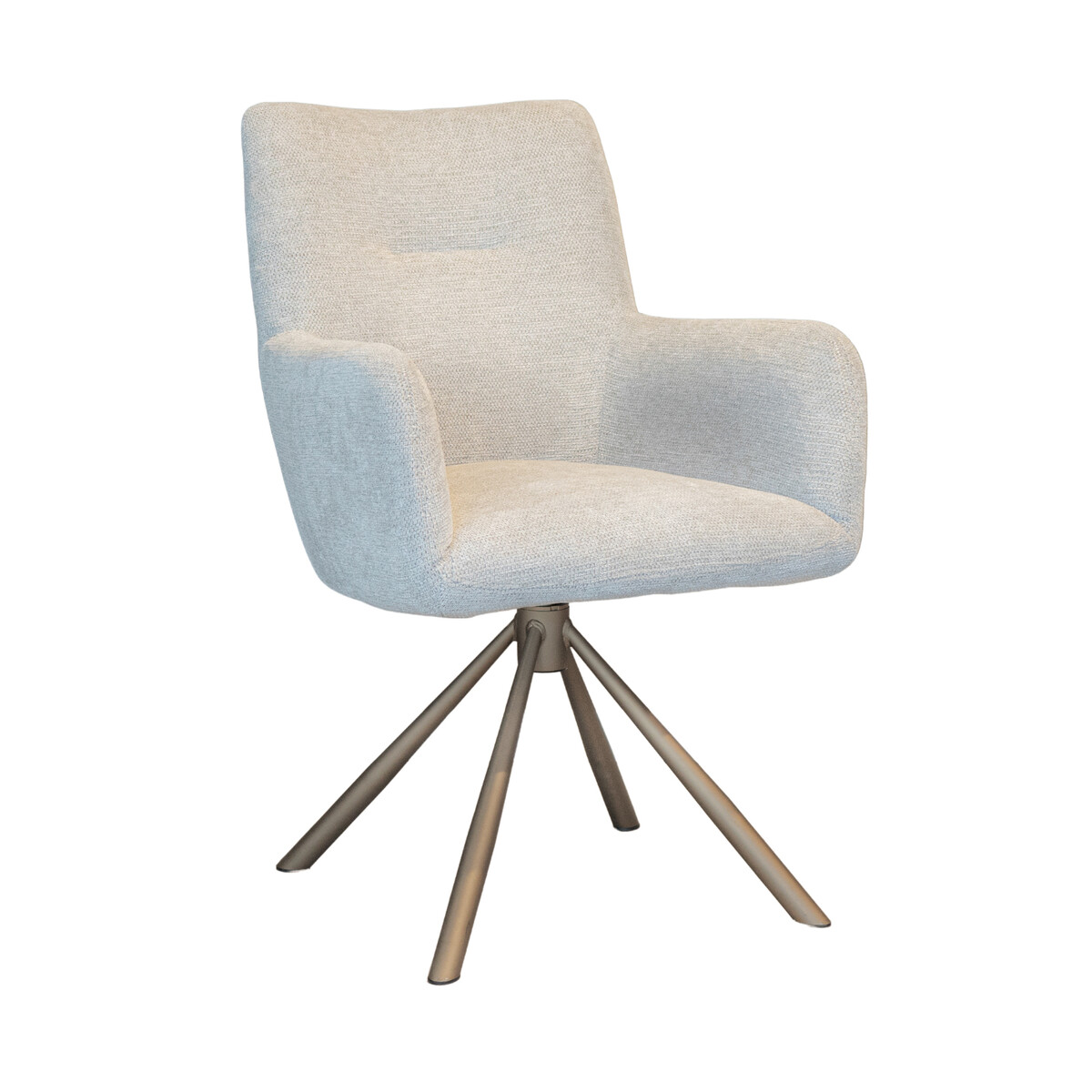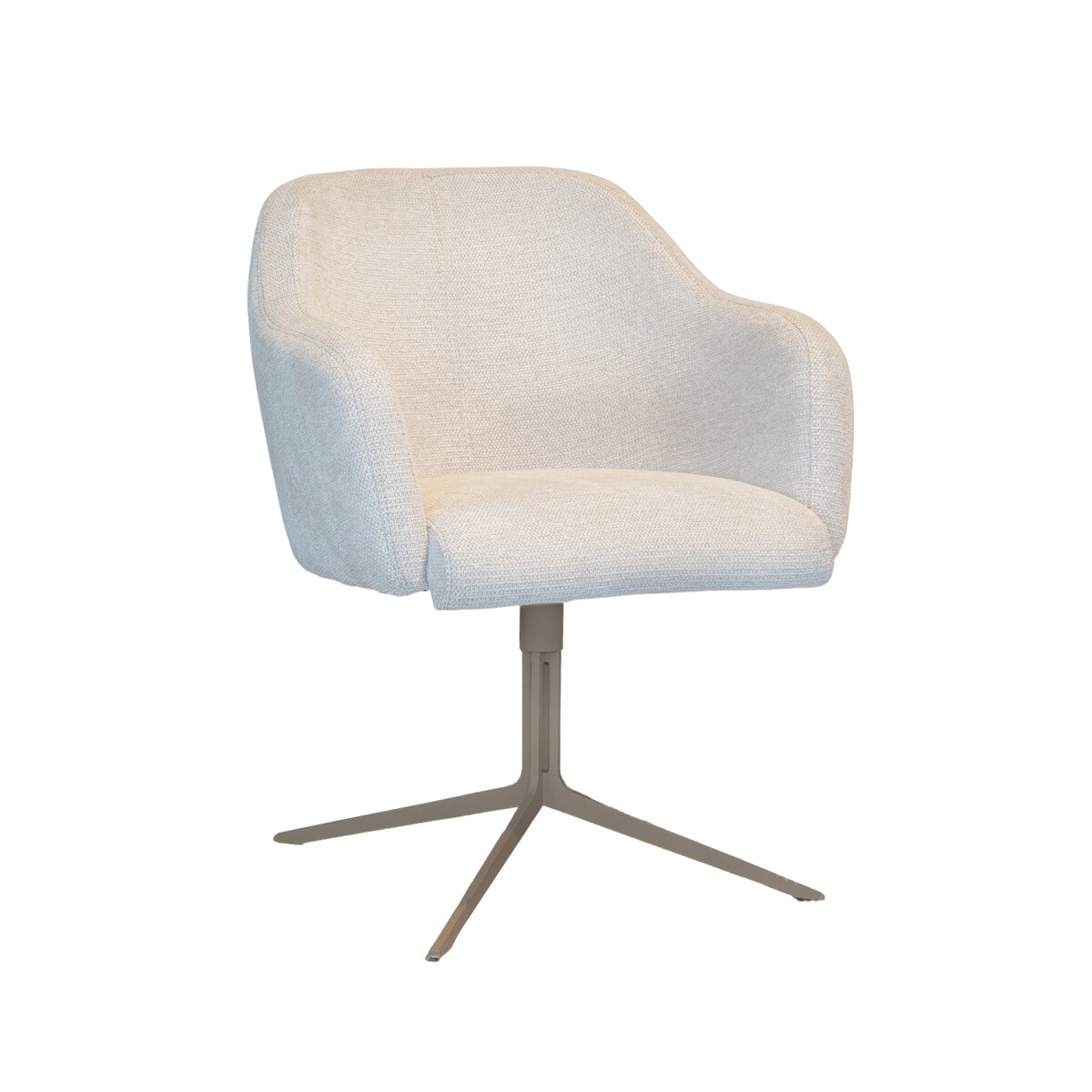In de showroom uitgevoerd in stofgroep Mito in de kleur Beige, door de gemêleerde stof niet te licht, niet te donker.