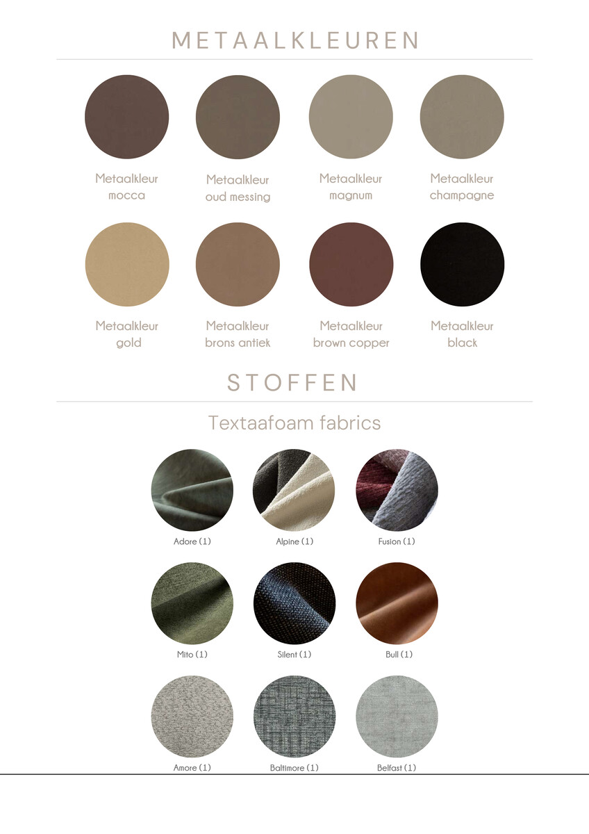 Er zijn 9 stoffen verkrijgbaar in stofgroep 1 en wel meer dan 100 stoffen in stofgroep 2 waar je uit kunt kiezen. Verder zijn er 9 metaal kleuren verkrijgbaar.