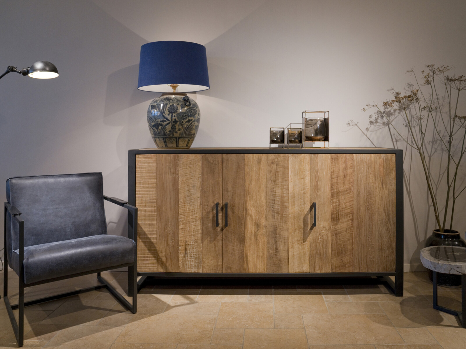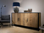 Dressoir 180 cm uit de METAL Collectie. Massief teakhout met mat zwart metalen frames, drie deuren en drie legplanken. De meubels uit de METAL Collectie zijn gemaakt van oud recycled teak hout, en hebben een zwart stalen frame met lades en deuren waar gemakkelijk van alles in opgeborgen kan worden. Het teak hout is doorleefd, met glad oppervlak, en een warme uitstraling. Gecombineerd met de industriële mat zwarte stalen frames zijn ze een stoere verschijning.