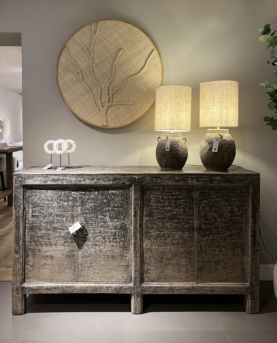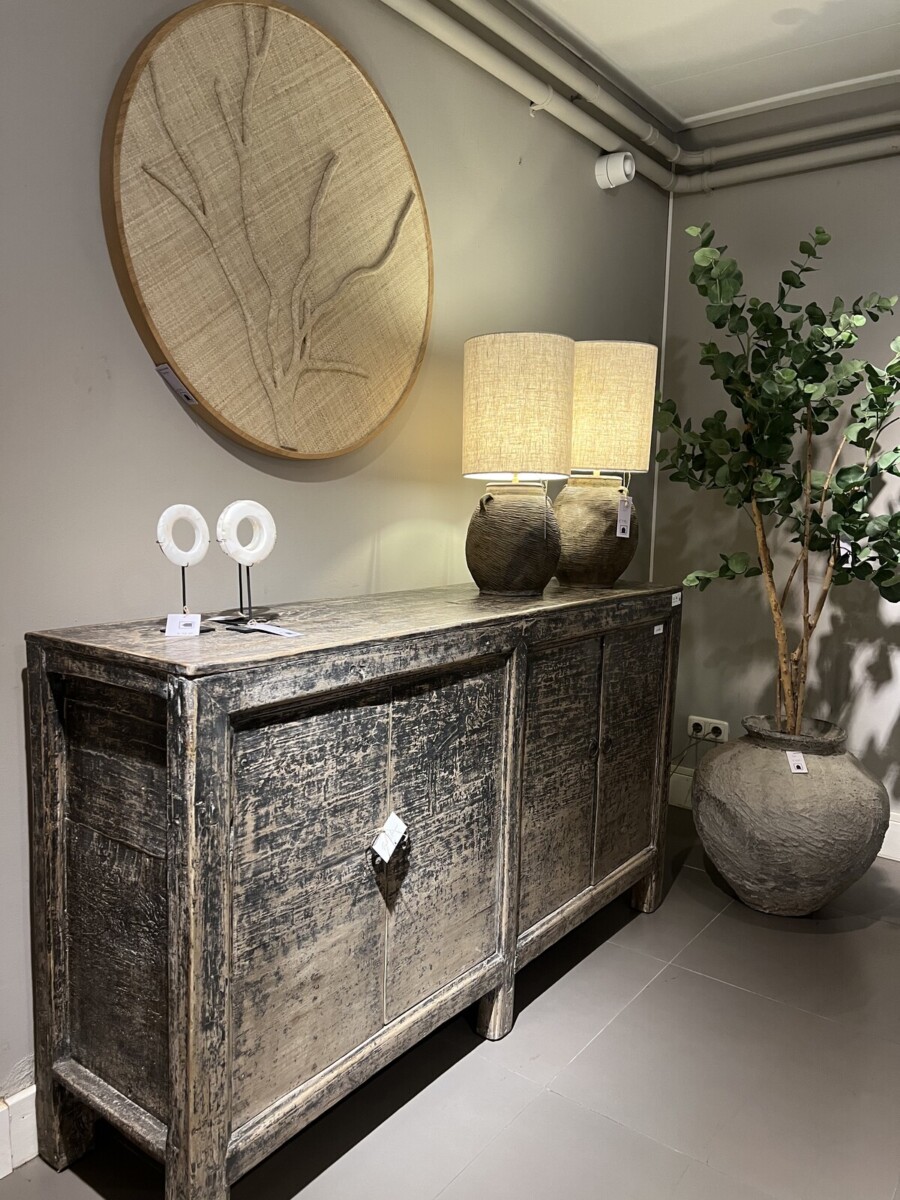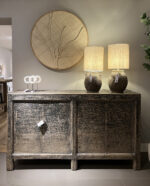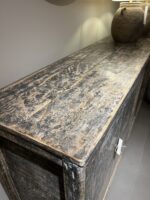Dit dressoir met 4 deuren is gemaakt van massief grenen met een donkere patina die verweerd is door de tijd. Binnenin uitgerust met vier legplanken om je spulletjes op te bergen.