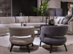 Er is keuze uit ruim 700 verschillende soorten stoffen, leder en kleuren, en tevens 12 kleuren hout voor het onderstel. Kom naar de showroom om proef te zitten en de stalen te ontdekken.