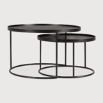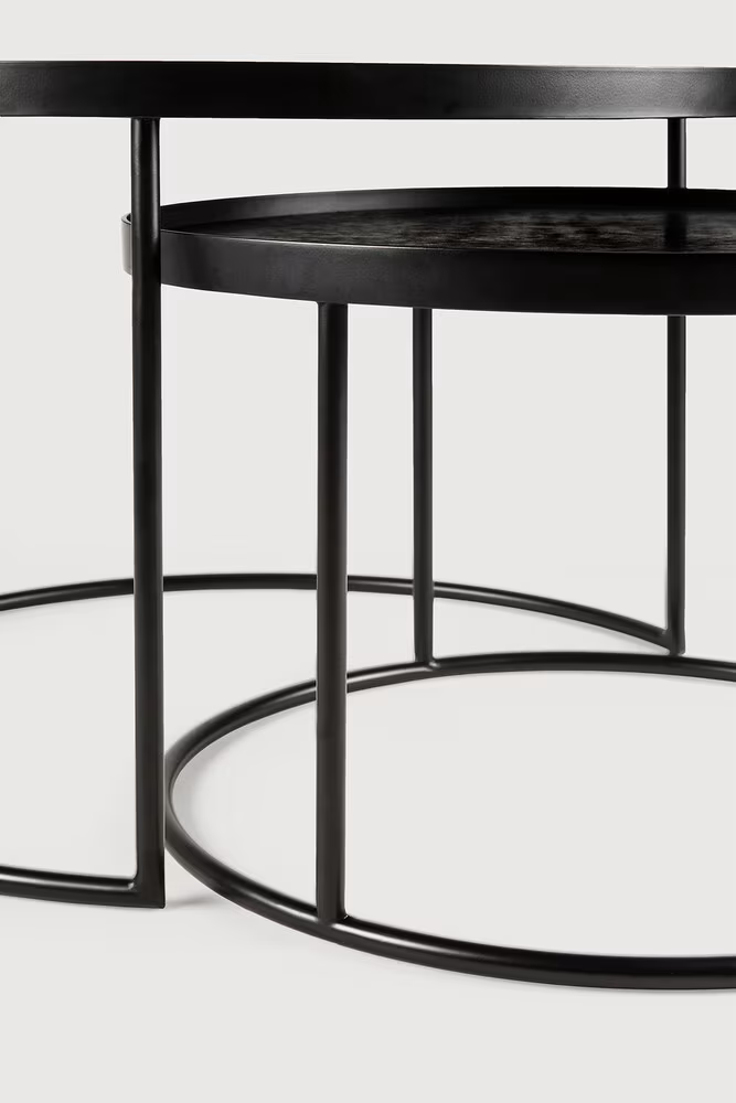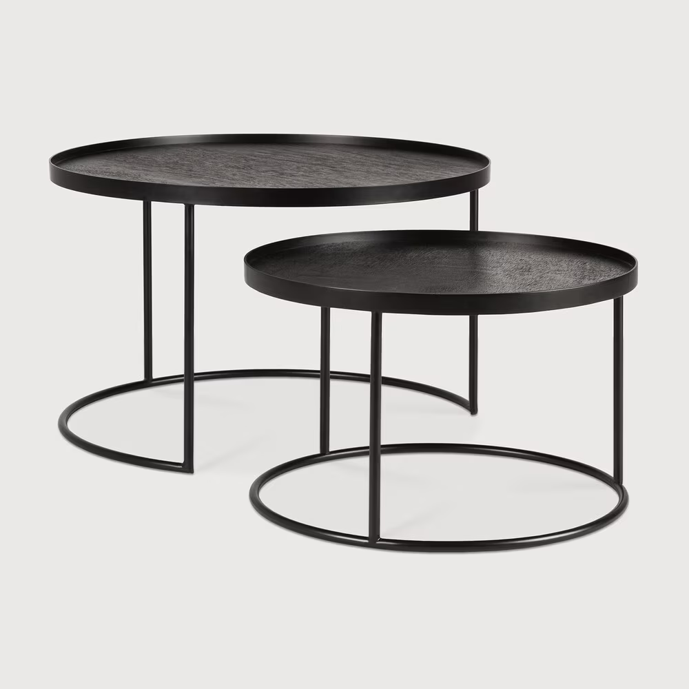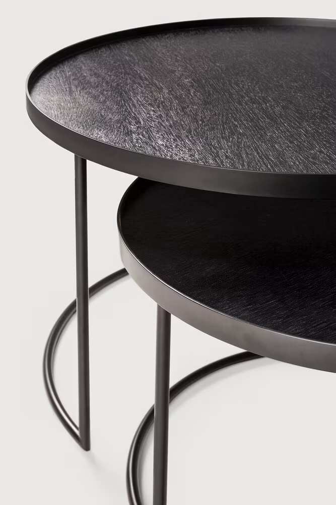 De Round Tray Table Salontafelset van Ethnicraft, zijn nesting tabels die je in en uit elkaar kunt schuiven en zijn gemaakt van staal waarbij het tafelblad is voorzien van een prachtig donker houten fineerlaag met vernis.