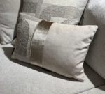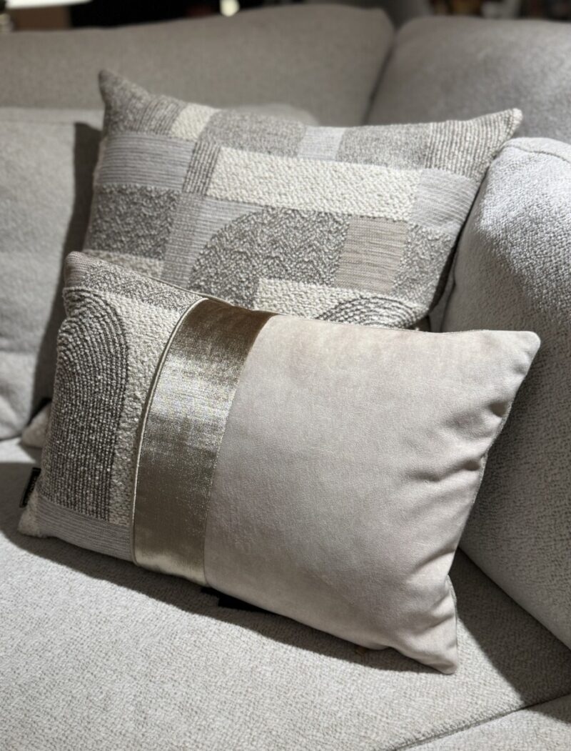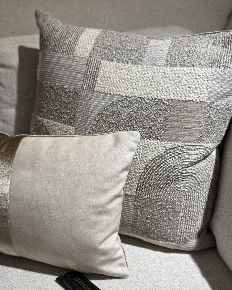 Dit zijn de sierkussens ‘Osaka’ en ‘Osaka strook’ van BRONS. Met prachtig grafisch city japandi dessin, handgemaakt in Nederland. Jacquard, ’n vleugje velvet & ’n zilveren champagne kleur.