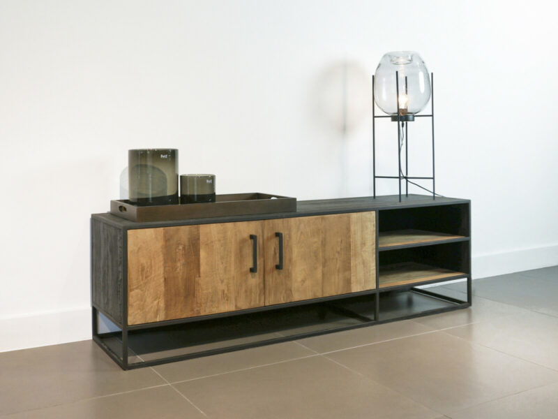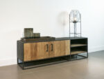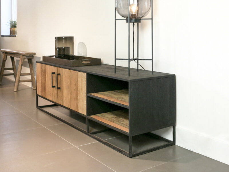 STEEL TV dressoir 170 is gemaakt van massief teakhout met mat zwart metalen frames, en heeft twee deuren met legplank en rechts twee nissen. De meubels uit de METAL Collectie zijn gemaakt van oud recycled teak hout, en hebben een zwart stalen frame met lades waar gemakkelijk van alles in opgeborgen kan worden. Het teak hout is doorleefd, met glad oppervlak, en een warme uitstraling. Gecombineerd met de industriële mat zwarte stalen frames zijn ze een stoere verschijning.