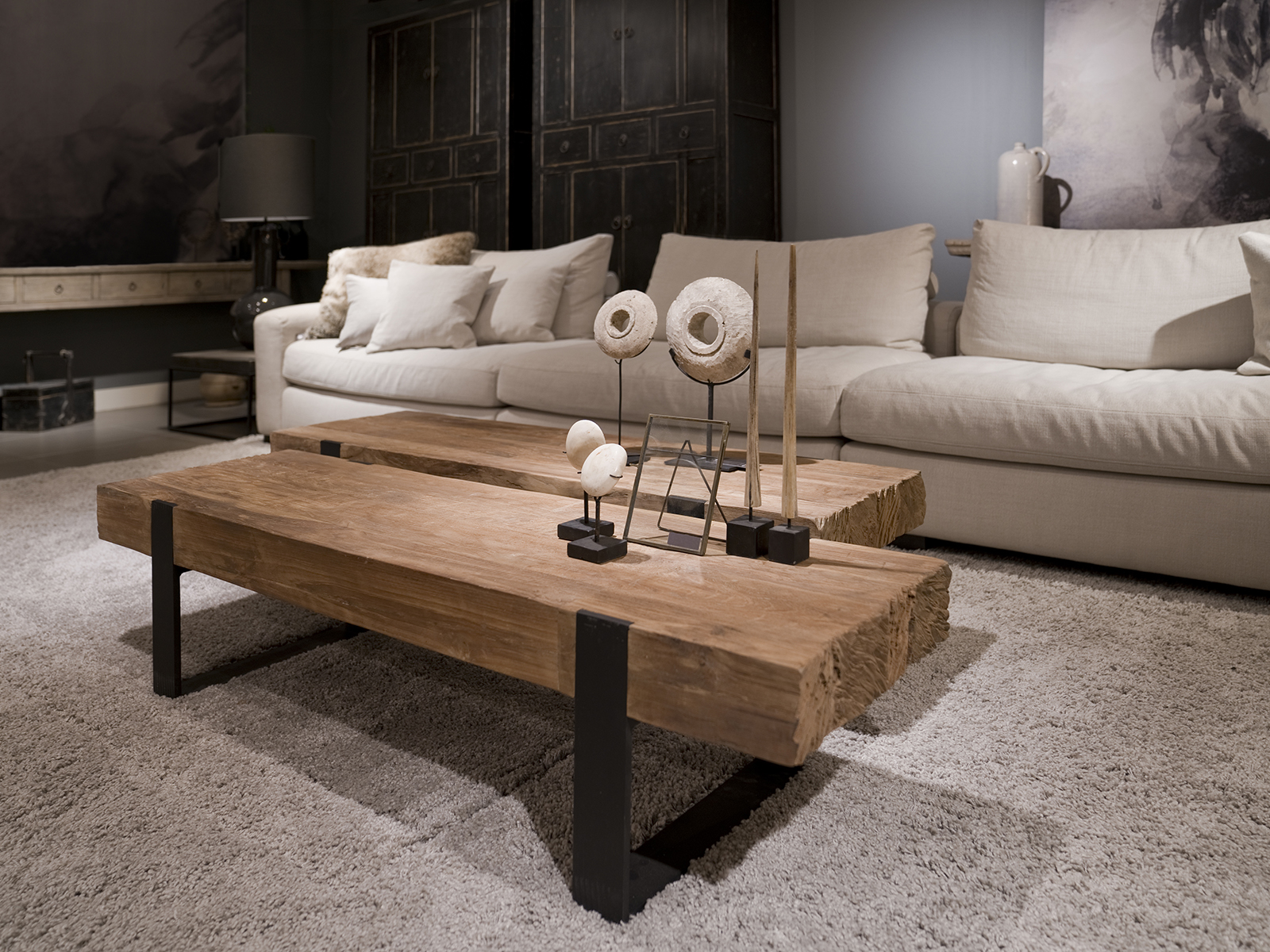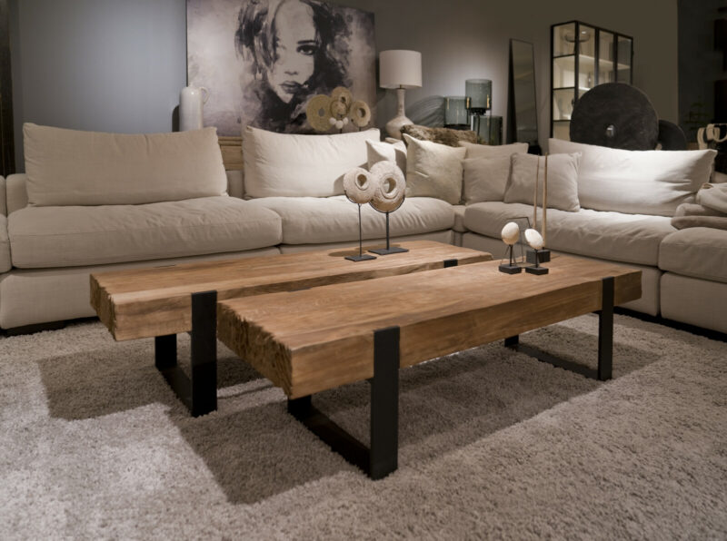 The robust BigBoy Slim coffee table from the STOER Collection has a particularly thick solid wood top of 9 cm thick, made of lived-in teak, with the short ends having a rough finish in a beautifully cut pattern. Particularly beautiful craftsmanship in which the industrial matt black steel frame is tightly incorporated into the top.