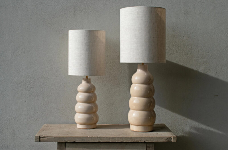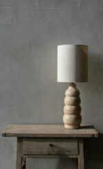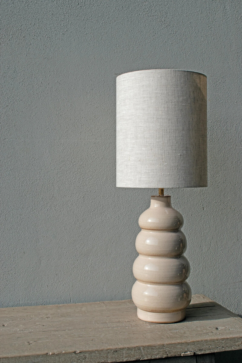 Voet van aardewerk met organische vorm en een naturel linnen kap.