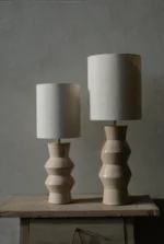 Tafellamp Dominique heeft een leuke voet van beige gekleurd geglazuurd keramiek, met in het midden 2 grote ribbels en een naturel kleurige linnen kap. Mooi op een tafel en dressoir.