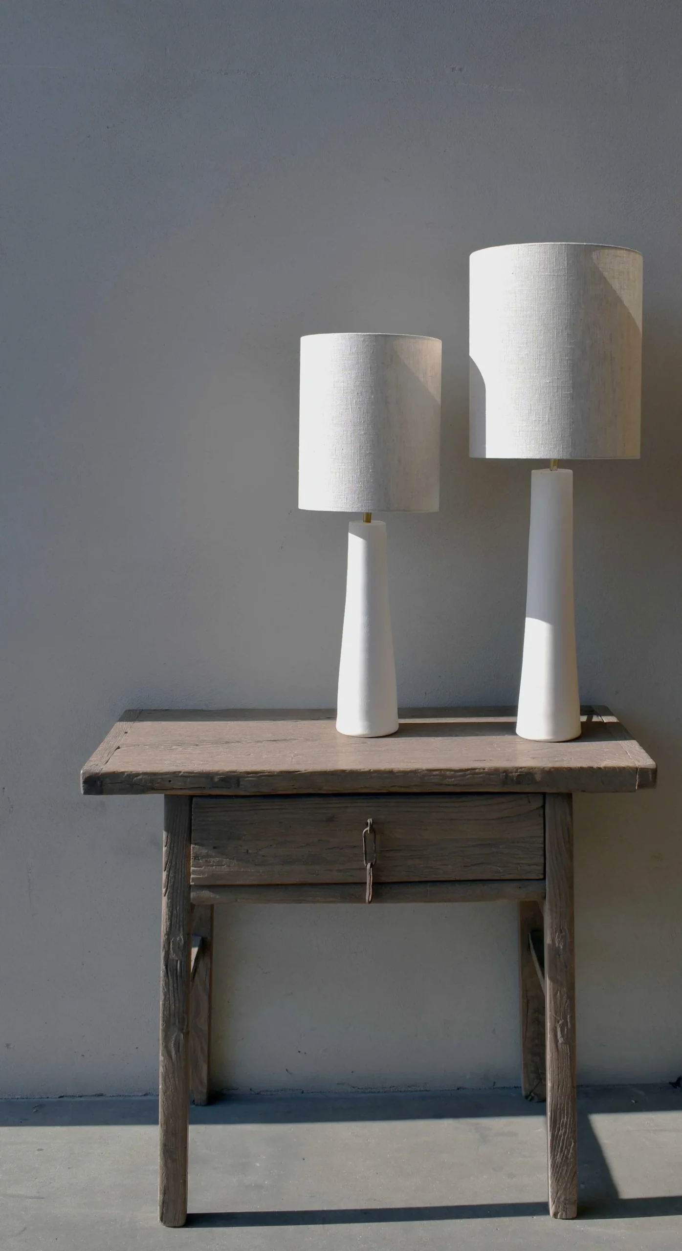 Tafellamp Fleur Chalk White heeft een slanke voet van krijtwit gekleurd geglazuurd keramiek met een naturel kleurige linnen kap. Mooi op een tafel en dressoir.