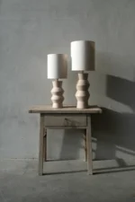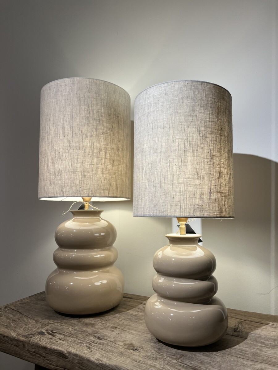 Tafellamp Dominique Small heeft een leuke voet van beige gekleurd geglazuurd keramiek, met in het midden 2 grote ribbels en een naturel kleurige linnen kap. Mooi op een tafel en dressoir.