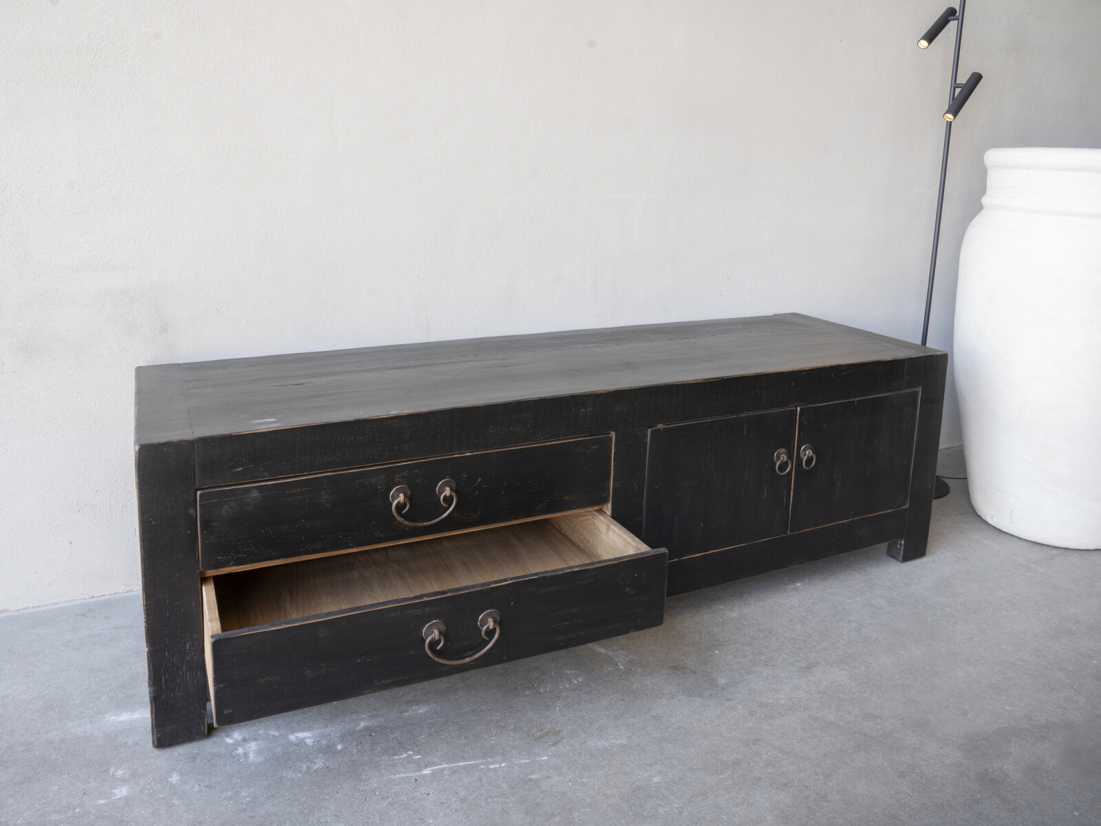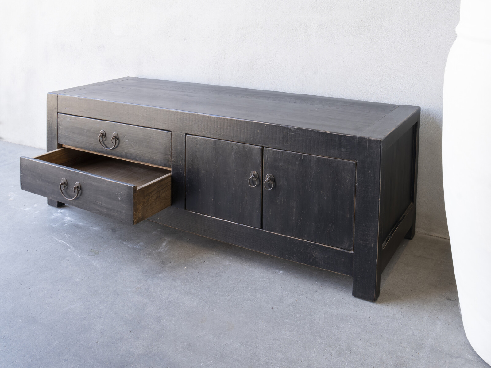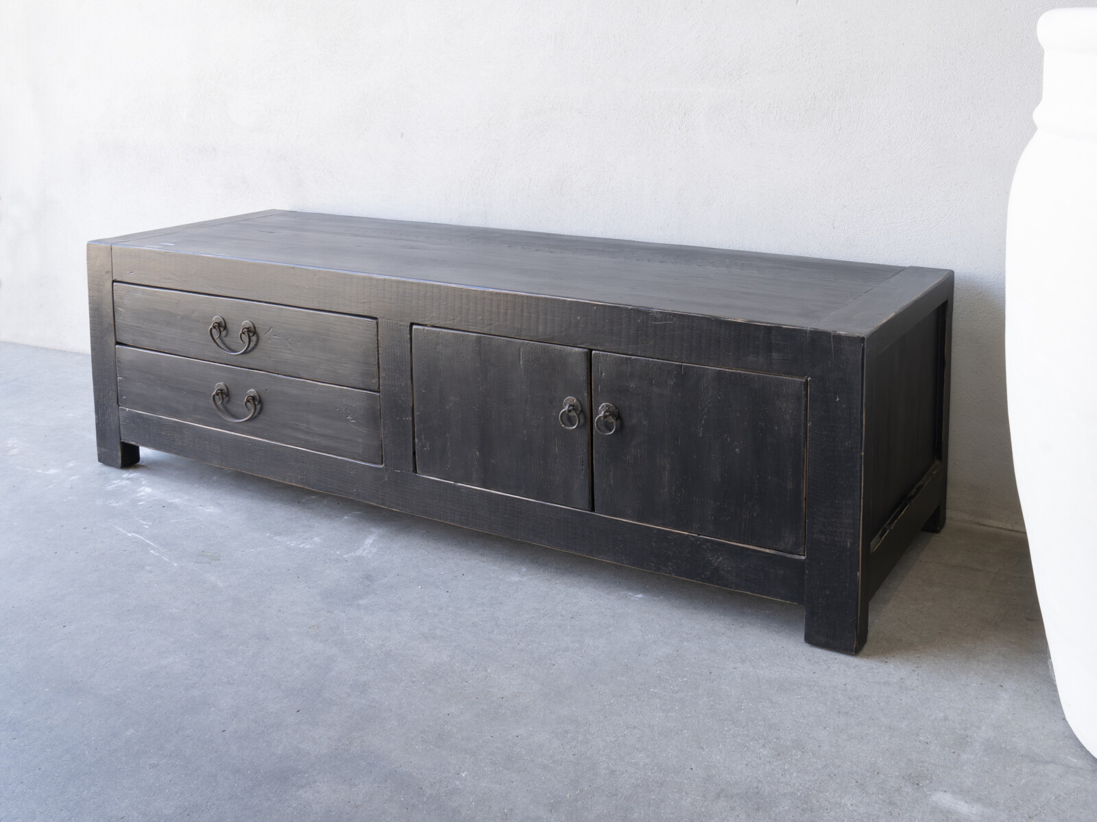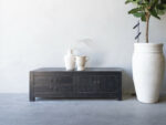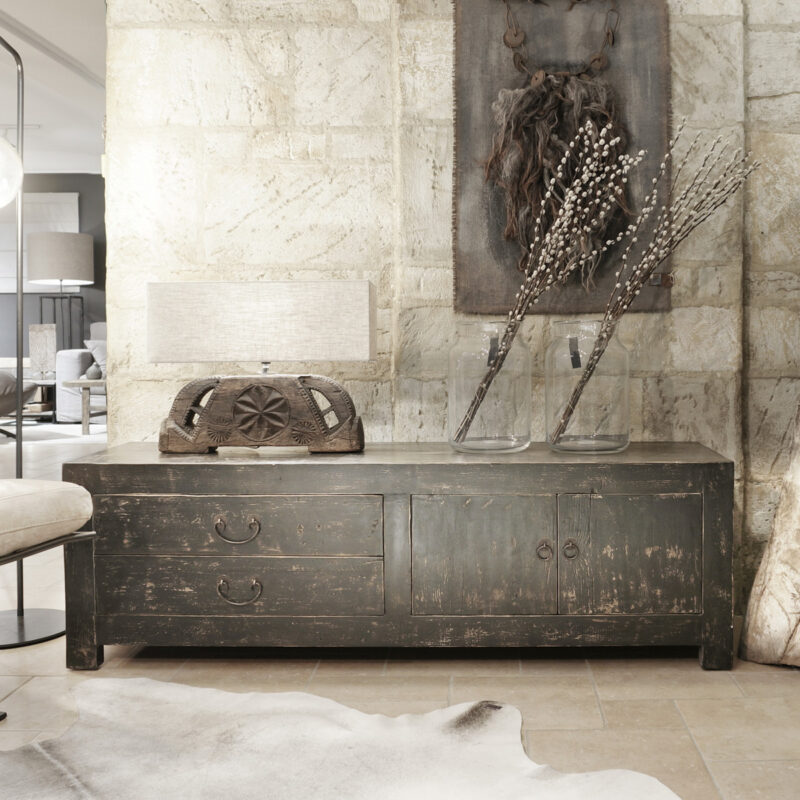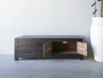 TV dressoir Mireille 180 CLASSIC Black is gemaakt van massief olmen hout met een mooie nerf structuur en een zwarte patina. Het TV dressoir heeft links twee ruime laden en rechts twee deuren met een legplank. Er is ook een naturel variant leverbaar.