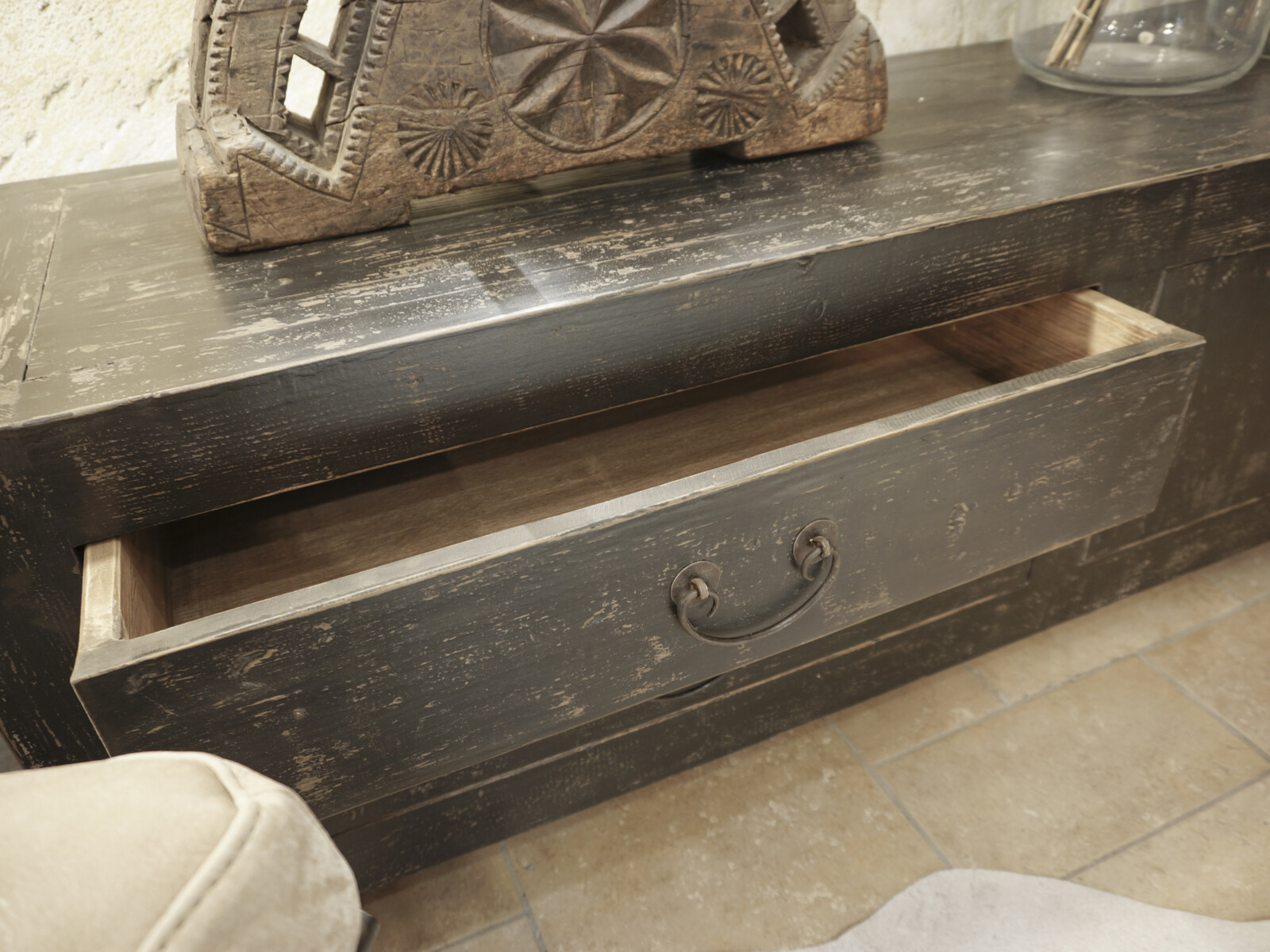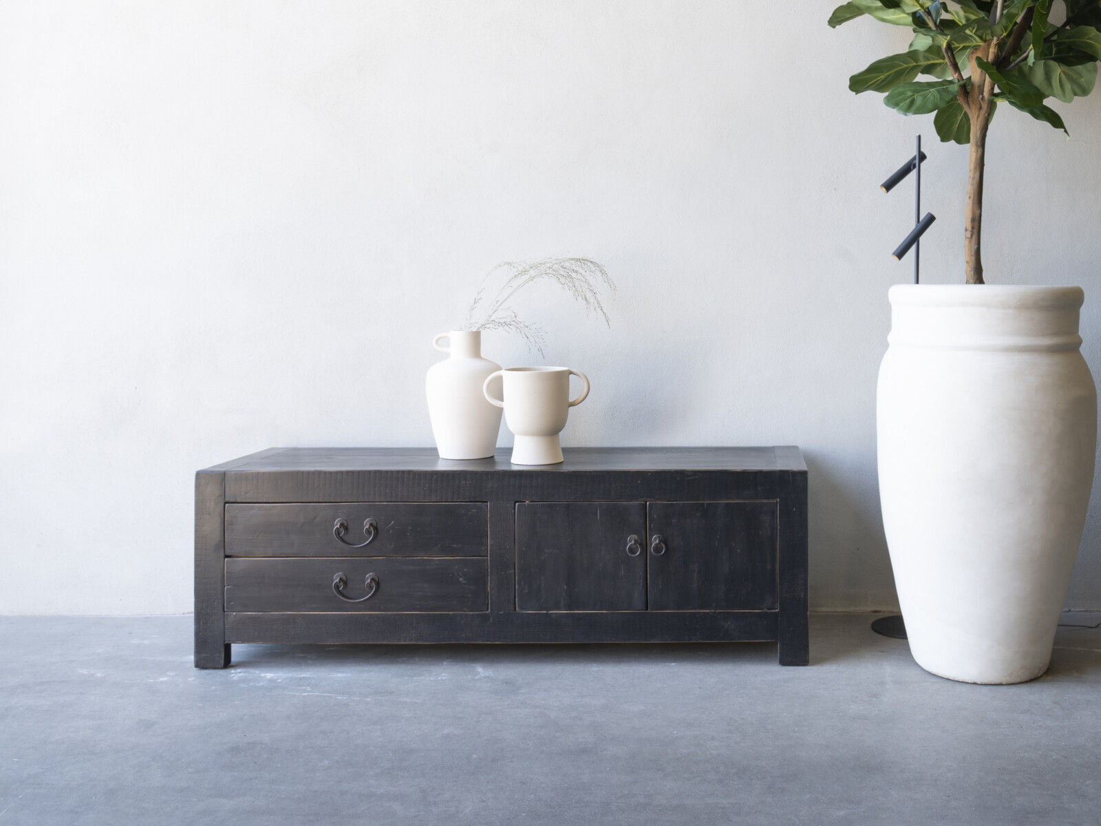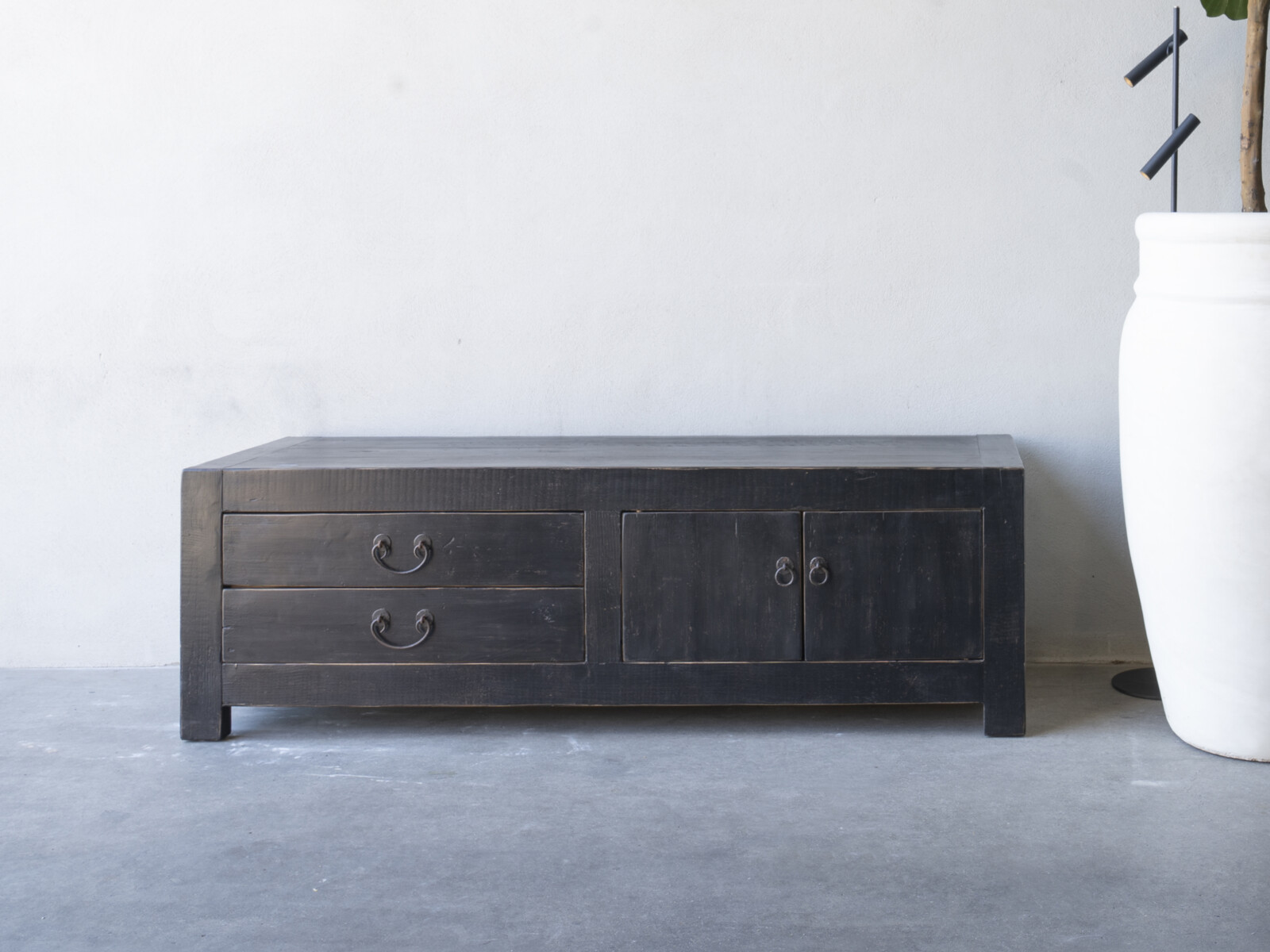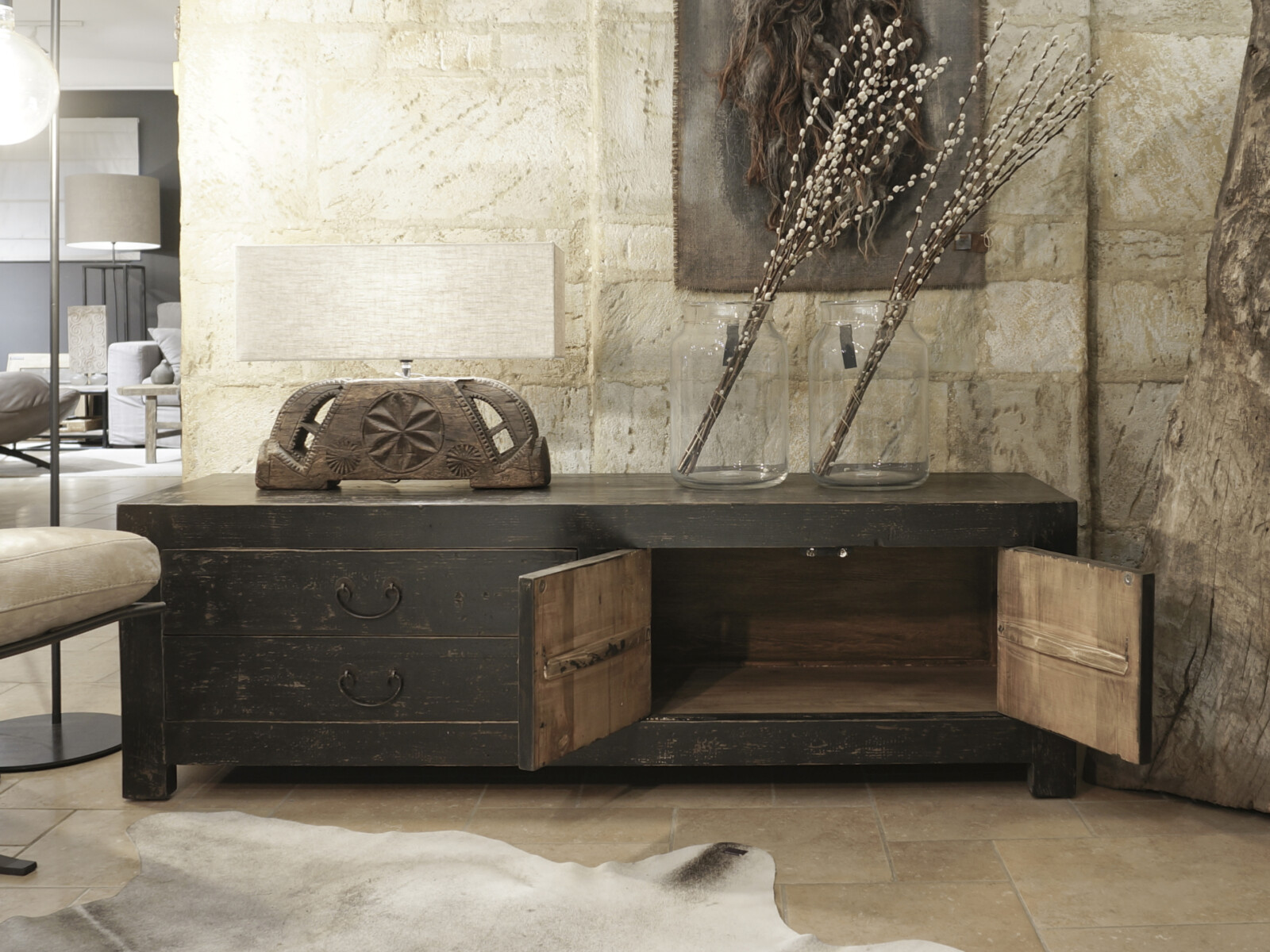 TV dressoir Mireille 180 CLASSIC Black is gemaakt van massief olmen hout met een mooie nerf structuur en een zwarte patina. Het TV dressoir heeft links twee ruime laden en rechts twee deuren met een legplank. Er is ook een naturel variant leverbaar.