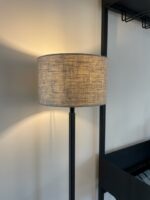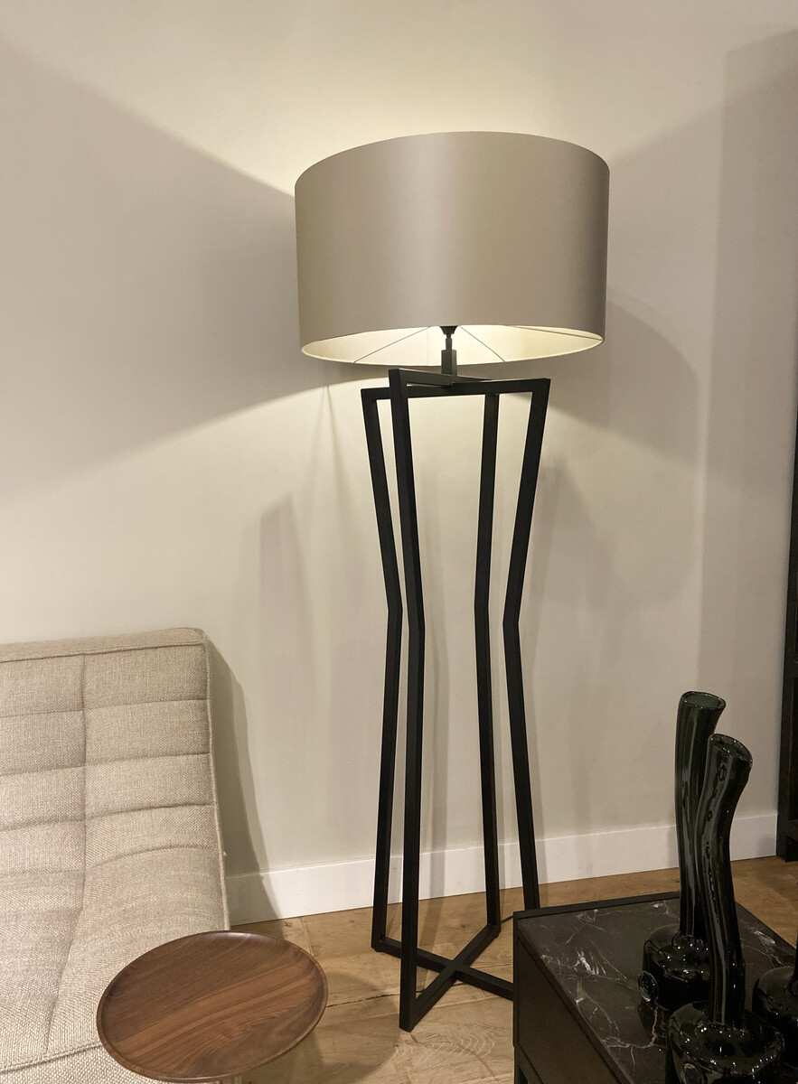 Vloerlamp Tim heeft een metalen kruisframe met ‘wespentaille’ en een klassieke satijnen lampenkap in een lichte taupe grijze kleur.