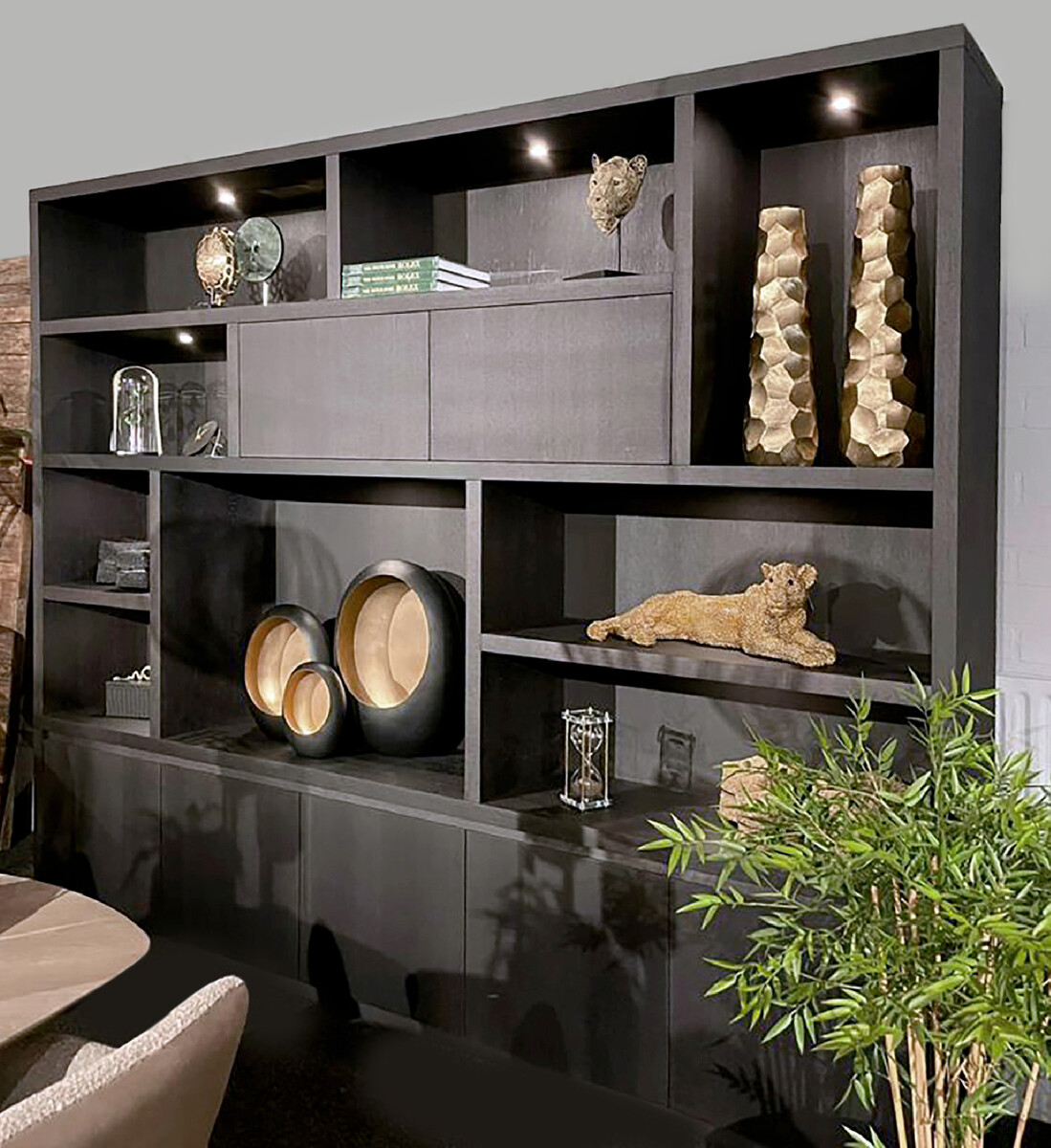 Op de afbeelding uitgevoerd in de kleur PP Charcoal/Antraciet, inclusief vier ingebouwde led spots om je woonaccessoires mee uit te lichten. De kast heeft onder 5 deuren boven 2 deuren en 9 nissen, waarvan één met een grotere maat van 119 x 87 cm voor een TV.