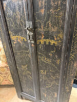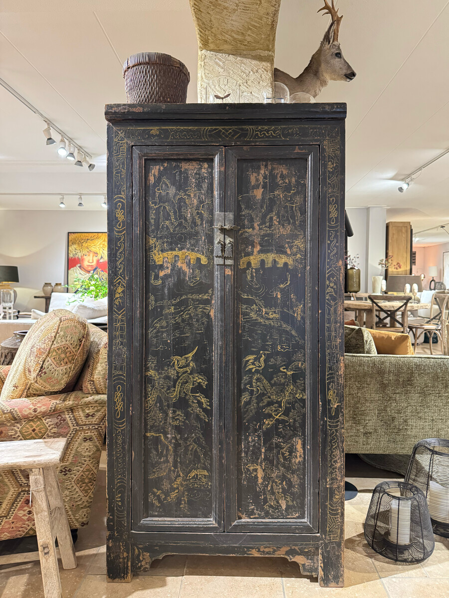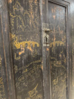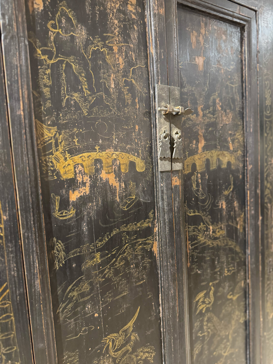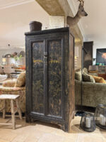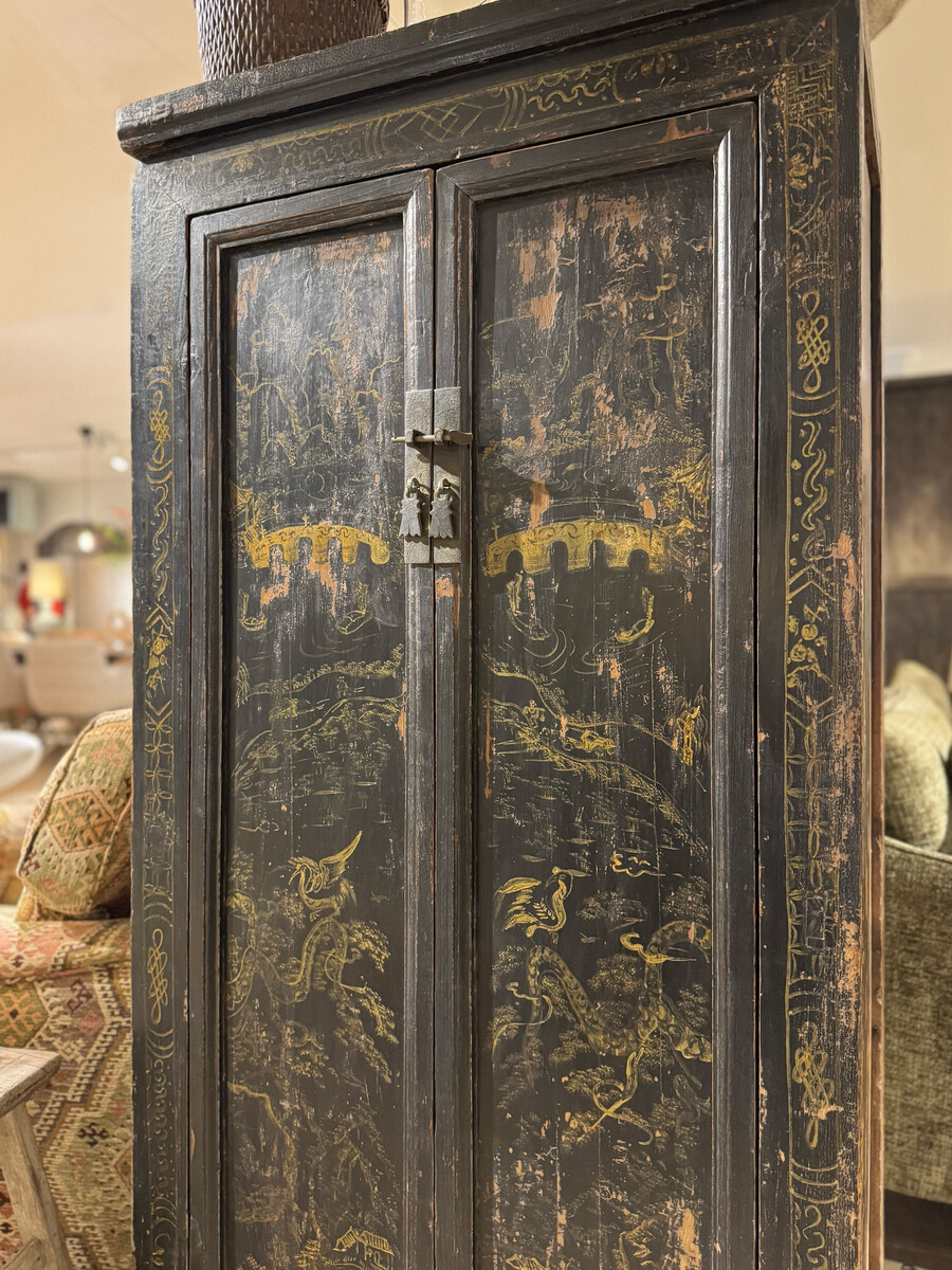Deze antieke kast is handbeschilderd met een mystiek Oosters landschap. De twee deuren met mooie bijzondere metalen sluiting geven toegang tot opbergvakken van vijf legplanken. De kast is gemaakt van iepenhout, een van de beste materiaalkeuzes die de tand des tijds doorstaat. Met de hand zwart geverfd, een kleur die verwijst naar een mysterieuze en fantastische ruimte (het universum) in een traditioneel Chinees concept. De voorste panelen hebben prachtige en traditionele vervaagde patronen van het mystieke landschap. Binnenin uitgerust met vijf legplanken om je spulletjes op te bergen.