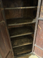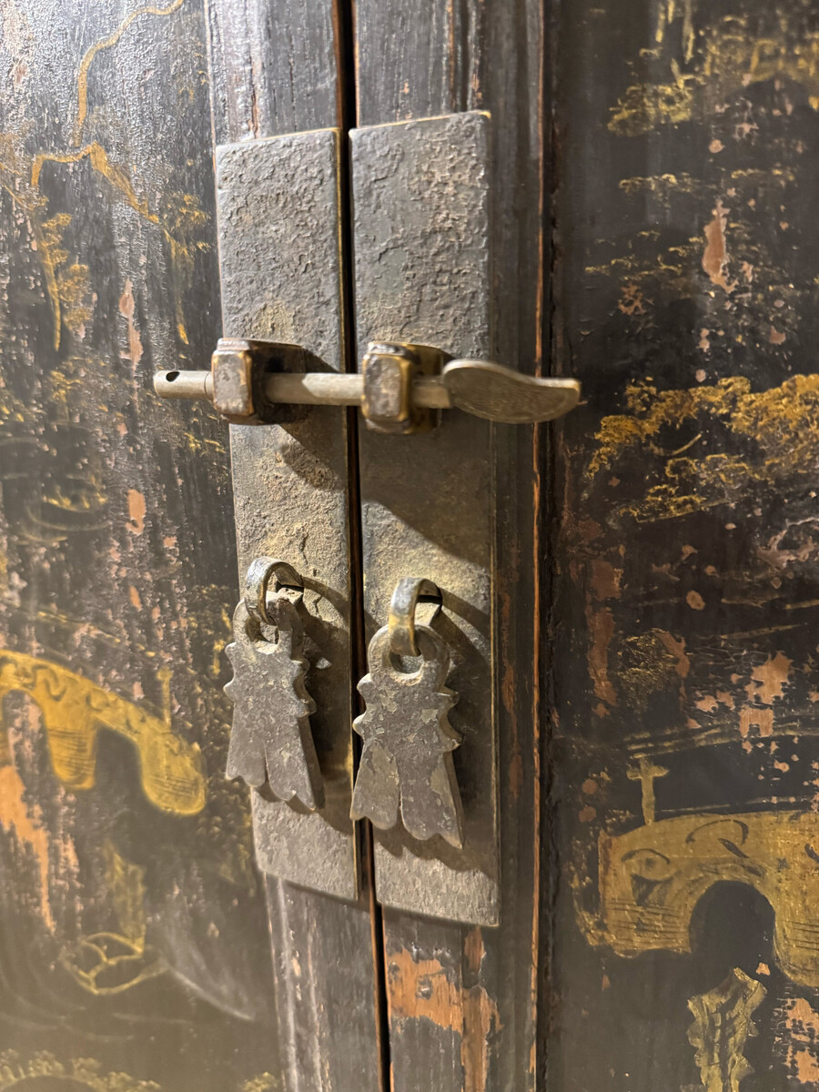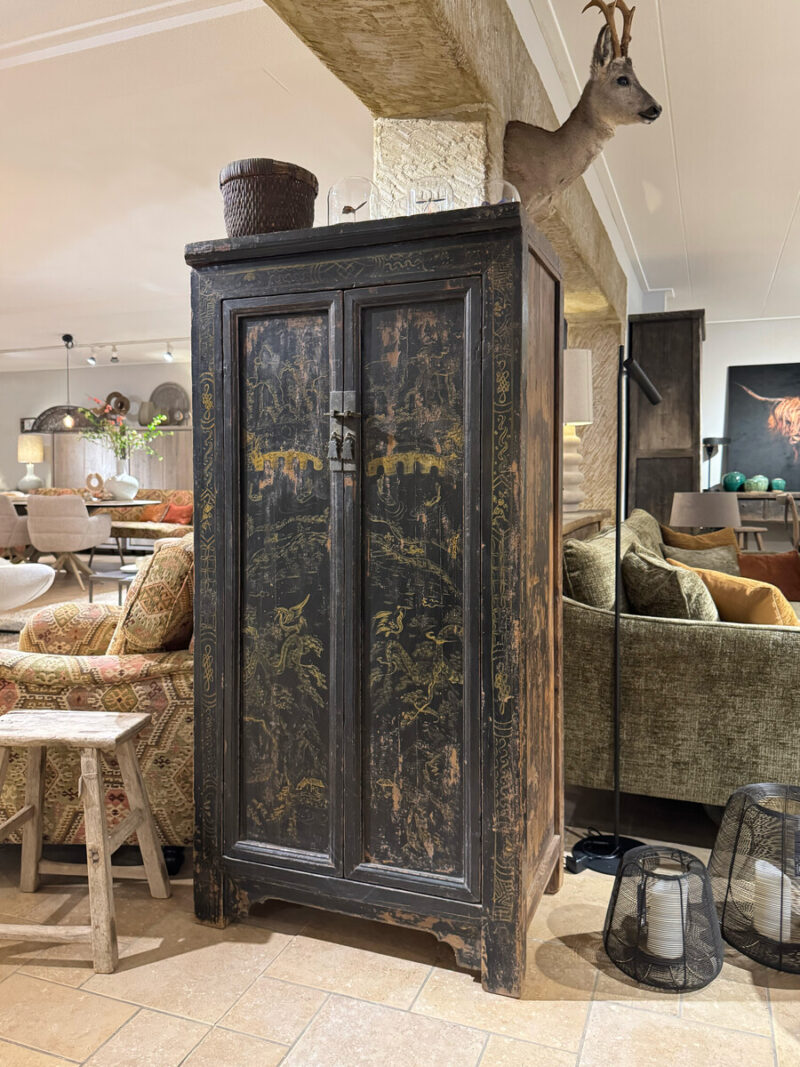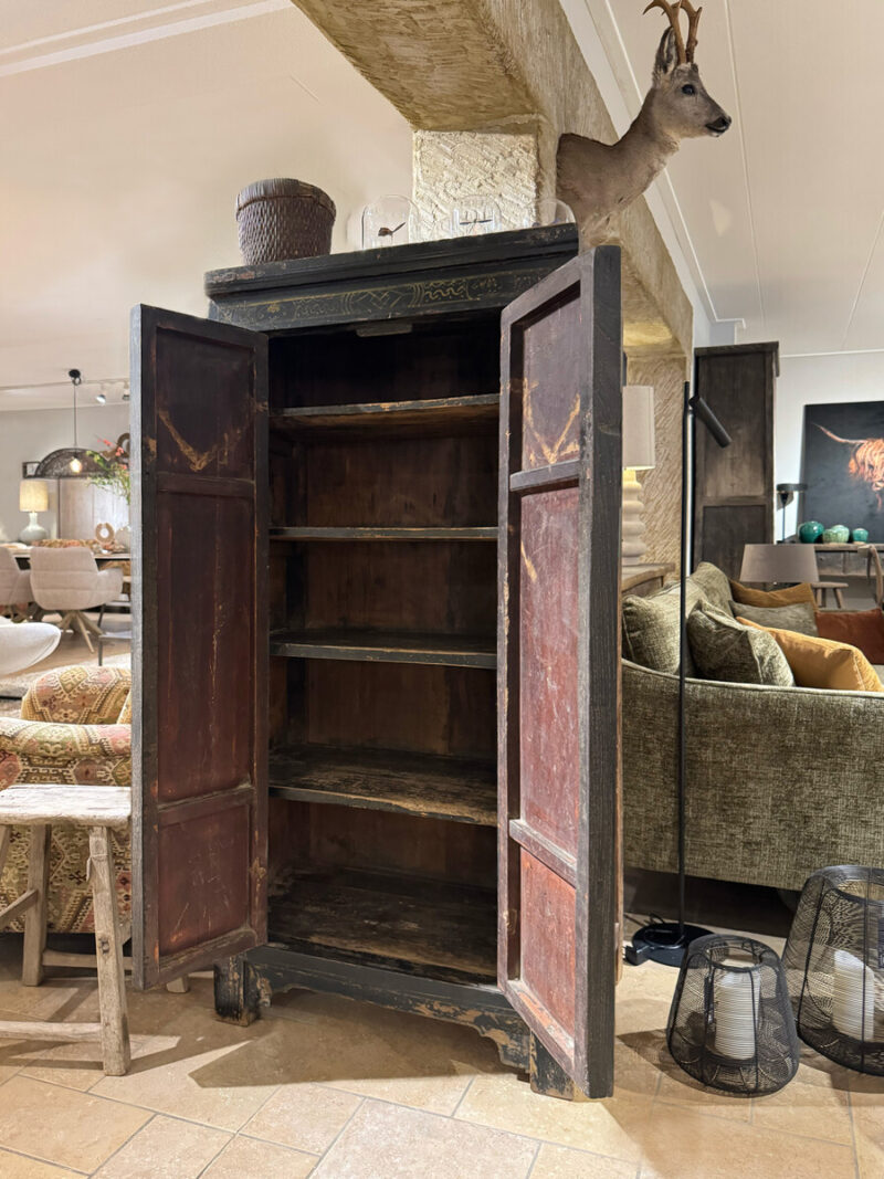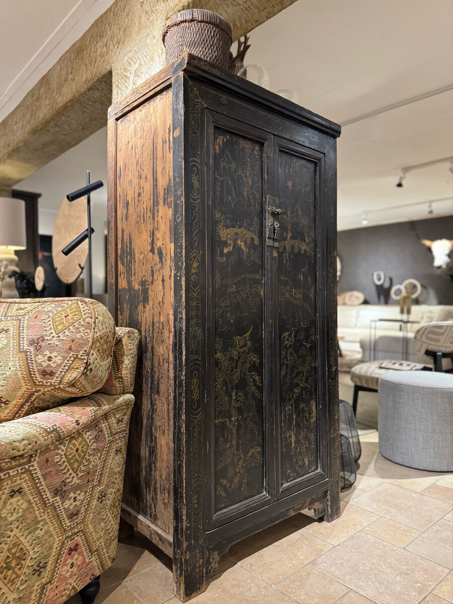 Deze antieke kast is handbeschilderd met een mystiek Oosters landschap. De twee deuren met mooie bijzondere metalen sluiting geven toegang tot opbergvakken van vijf legplanken. De kast is gemaakt van iepenhout, een van de beste materiaalkeuzes die de tand des tijds doorstaat. Met de hand zwart geverfd, een kleur die verwijst naar een mysterieuze en fantastische ruimte (het universum) in een traditioneel Chinees concept. De voorste panelen hebben prachtige en traditionele vervaagde patronen van het mystieke landschap. Binnenin uitgerust met vijf legplanken om je spulletjes op te bergen.