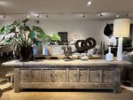 Dit antieke unieke lage dressoir van olmenhout is bewerkt met een ethnisch all-over dessin van ritmische repeterende lijnen van gebladerte en spiralen, wat met de hand is vervaardigd en een lak die verweerd is door de tijd. Voorzien van 8 deurtjes om je spulletjes in op te bergen.