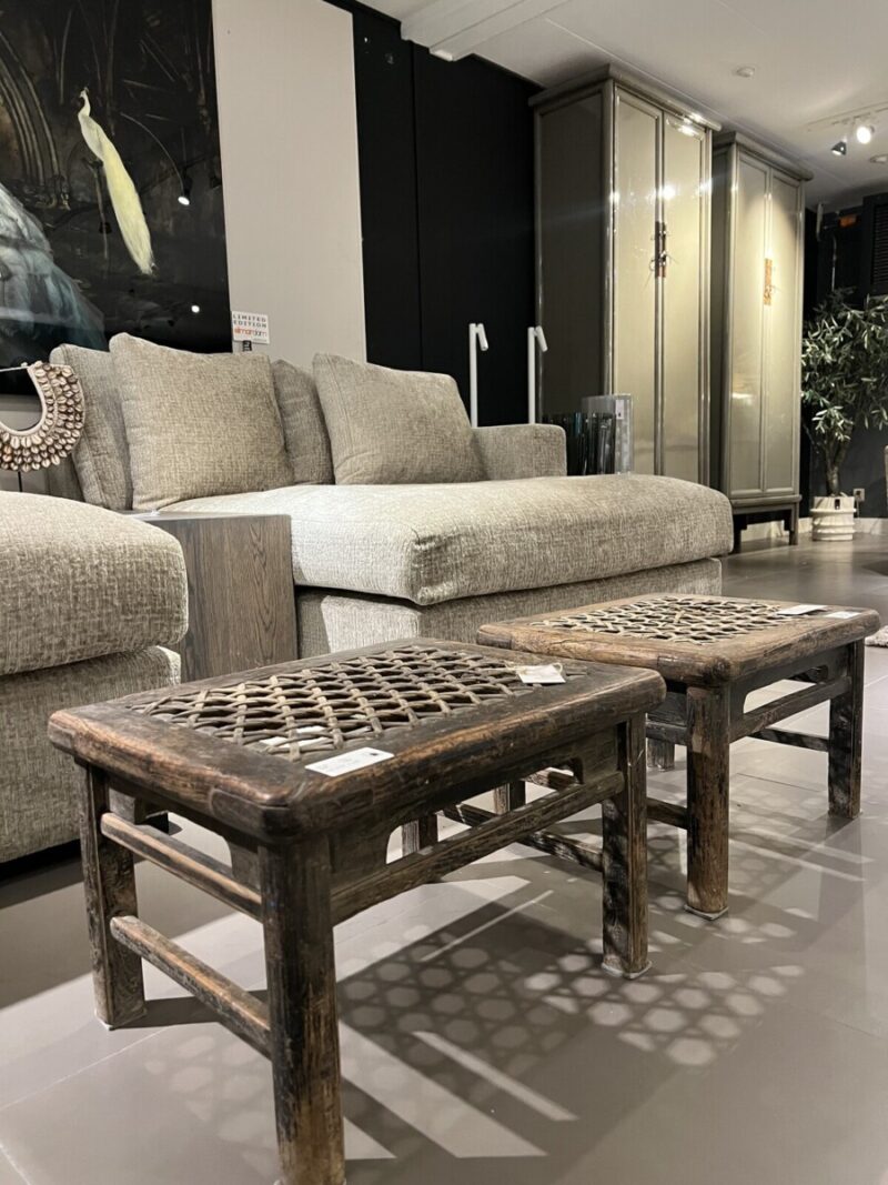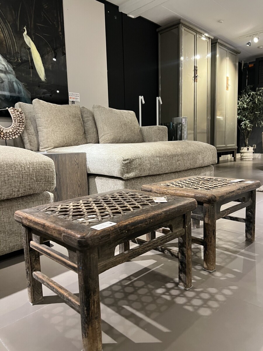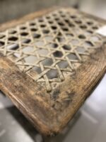 Antieke Oosterse bijzettafeltjes en/of stoeltjes met bijzonder gevlochten oppervlak en een verweerde donkere patina. Per stuk.