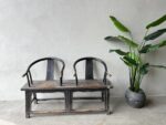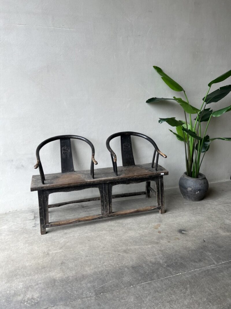 Antieke Chinese bruisstoelbank. Met bijzondere hout gesneden ornamenten en een verweerde donkere patina.