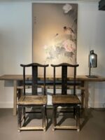 Antieke Chinese bruisstoelen. Met bijzondere hout gesneden ornamenten en een verweerde donkere patina.
