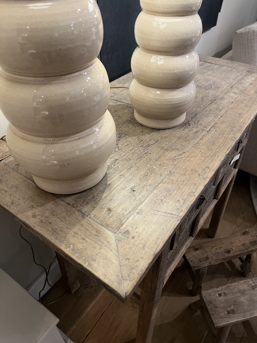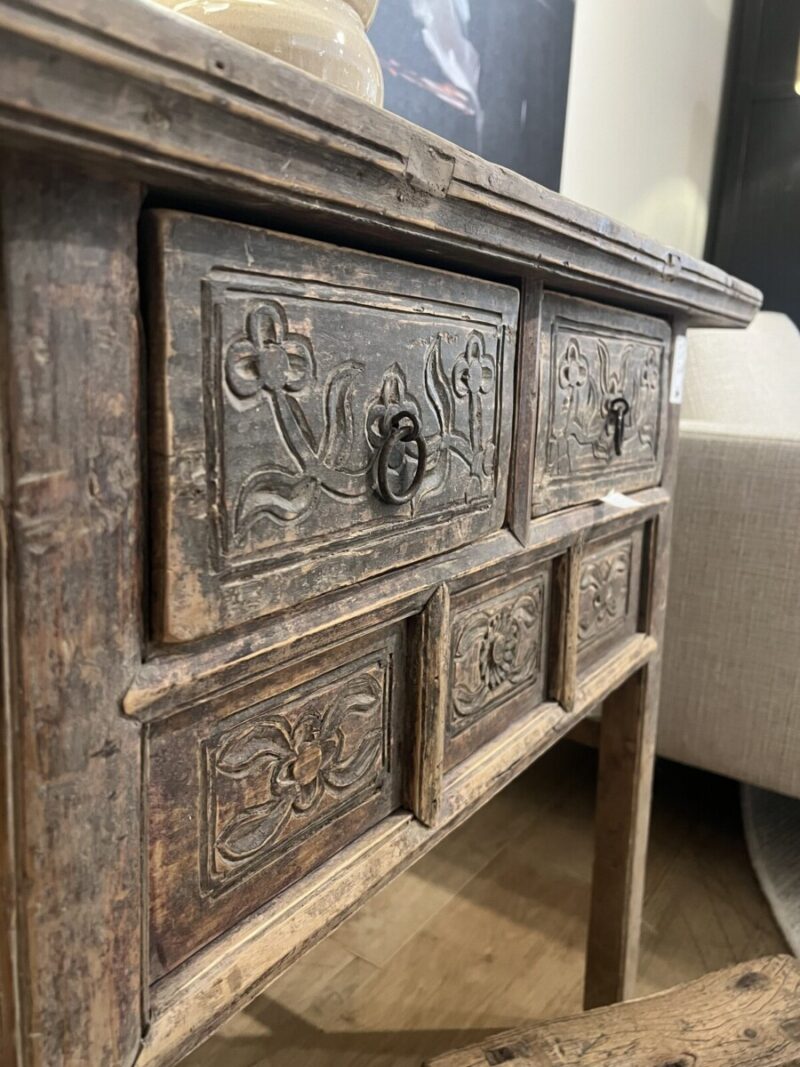 Antieke Chinese wandtafel gemaakt van massief old pinewood met 5 lades met sierlijke florale houtsnijwerken. Met stoer metaal beslag. Uniek karakter en warme uitstraling.