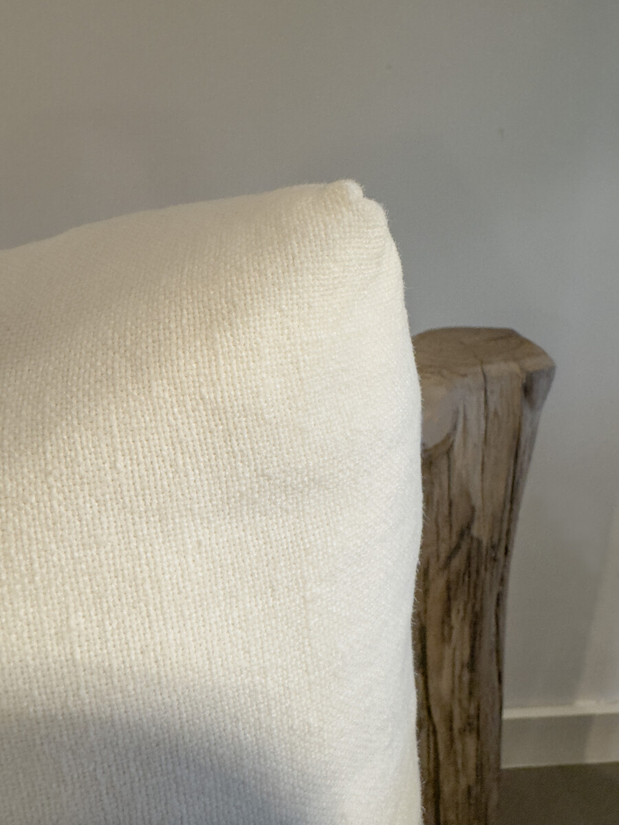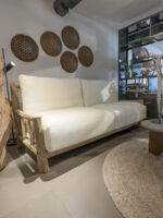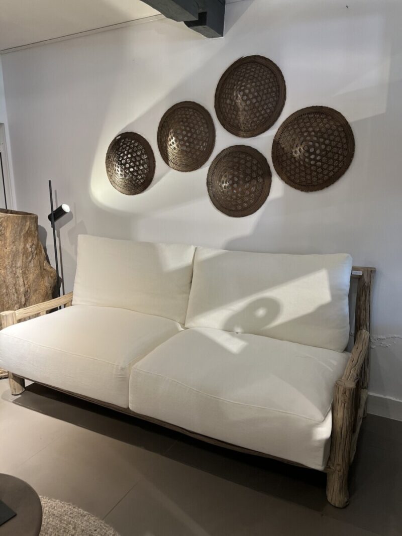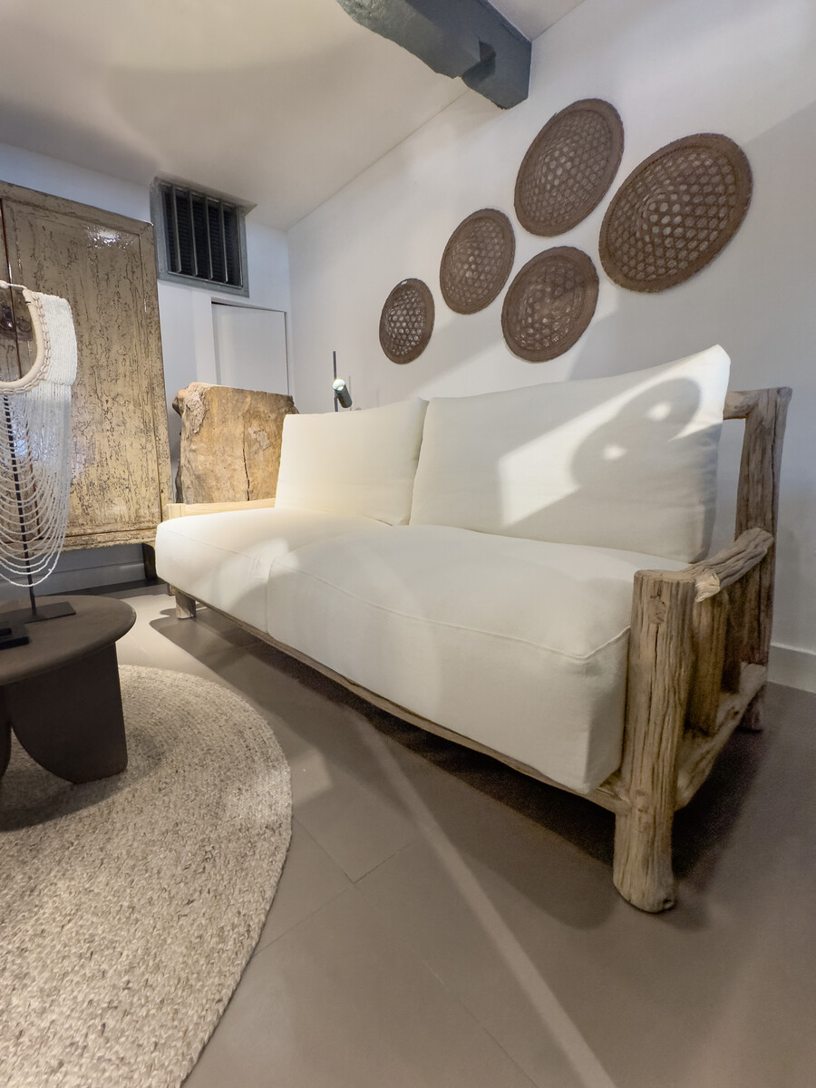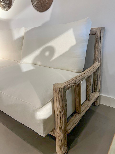 Deze bank brengt je naar de sfeer van de Mentawai Islands. Een natuurlijke bank gemaakt van massieve boomstammetjes en takken hardhout. De kussens zijn lekker dik en lekker zacht, gestoffeerd in ecru linnen.