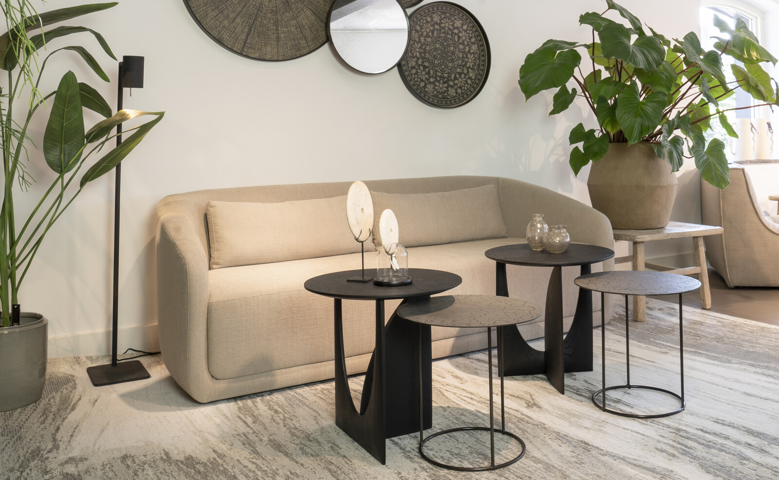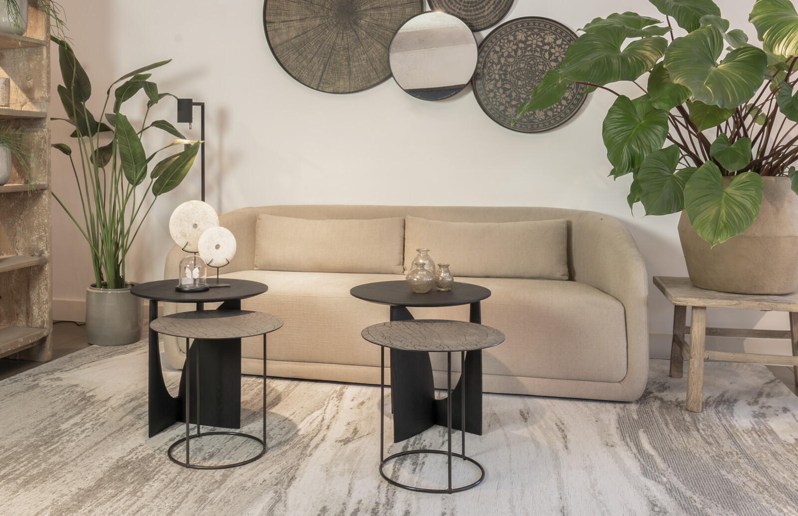 Elgante bank Trapeze van Ethnicraft uitgevoerd in de 3-zits variant (211cm) met twee bijpassende lendenkussens in de kleur beige.