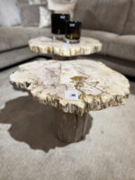 Salontafels met blad en voet beide van versteend hout in aardse tinten.