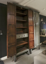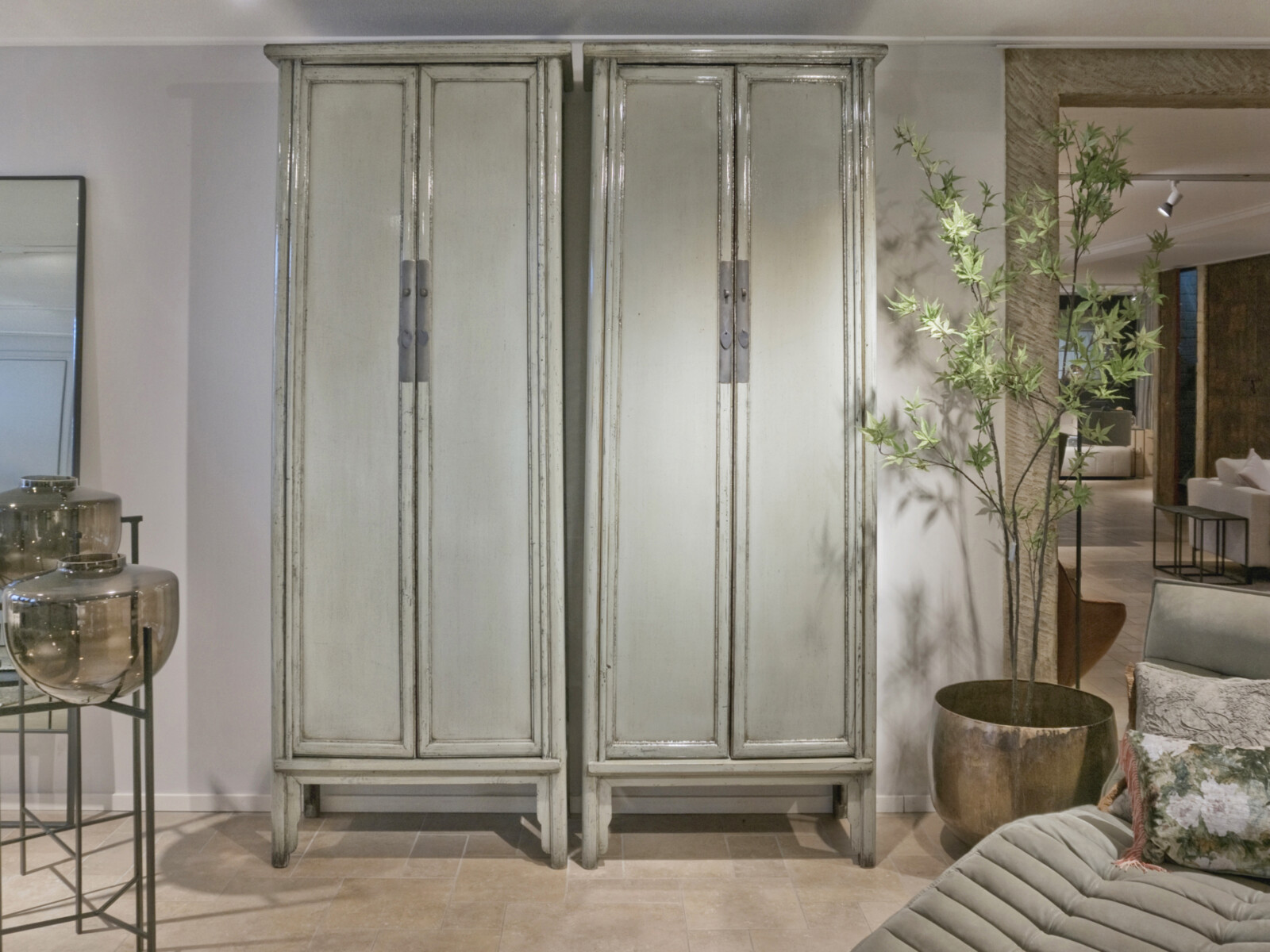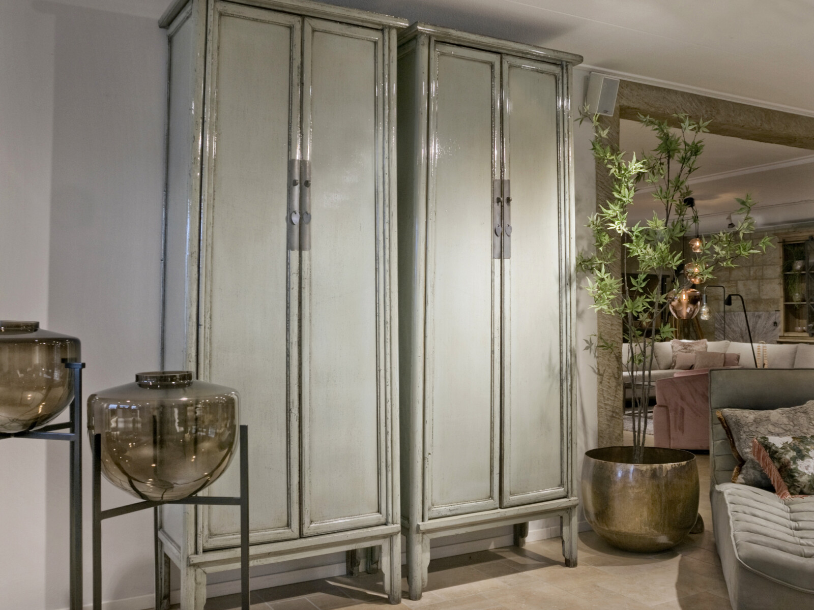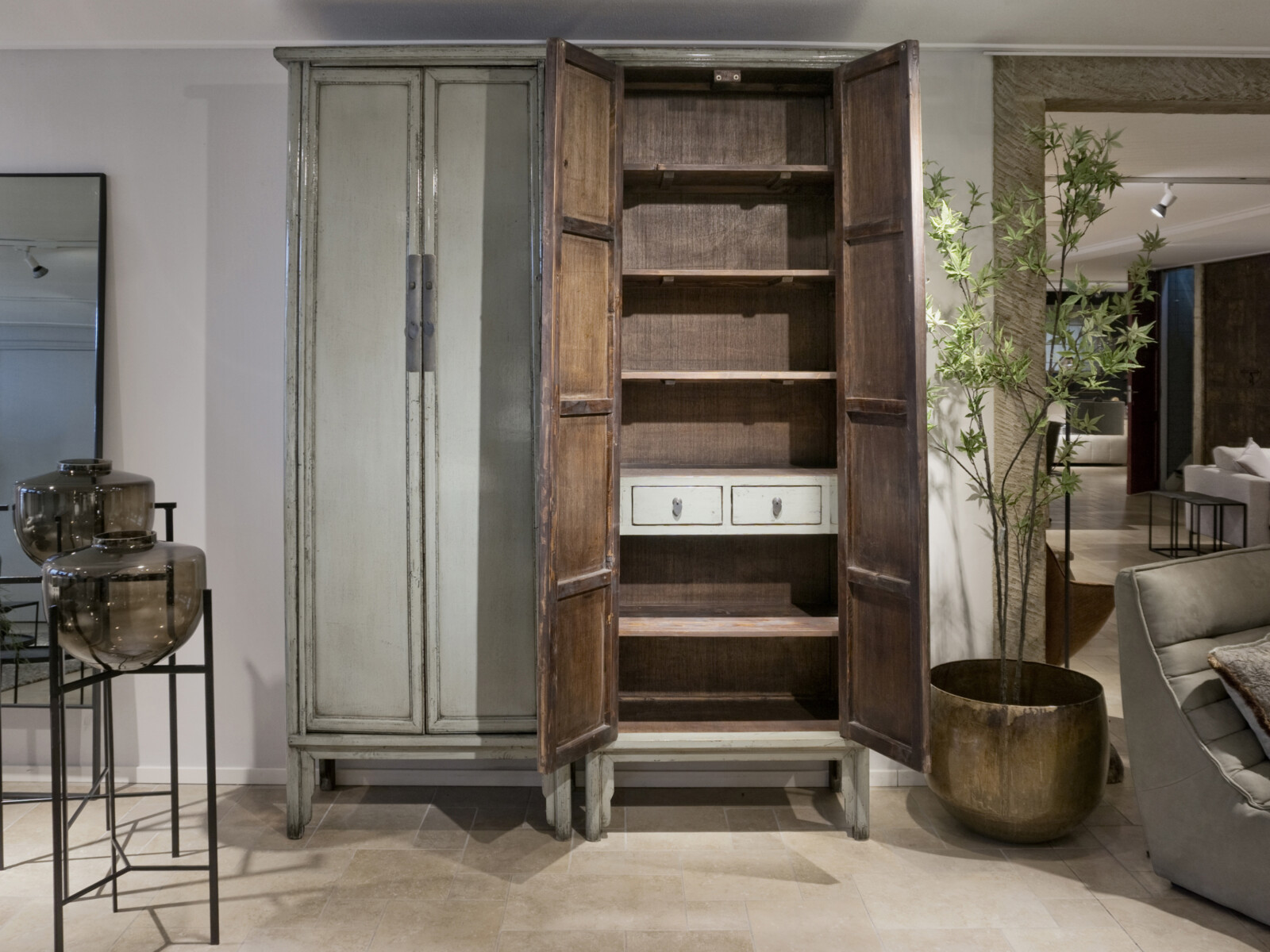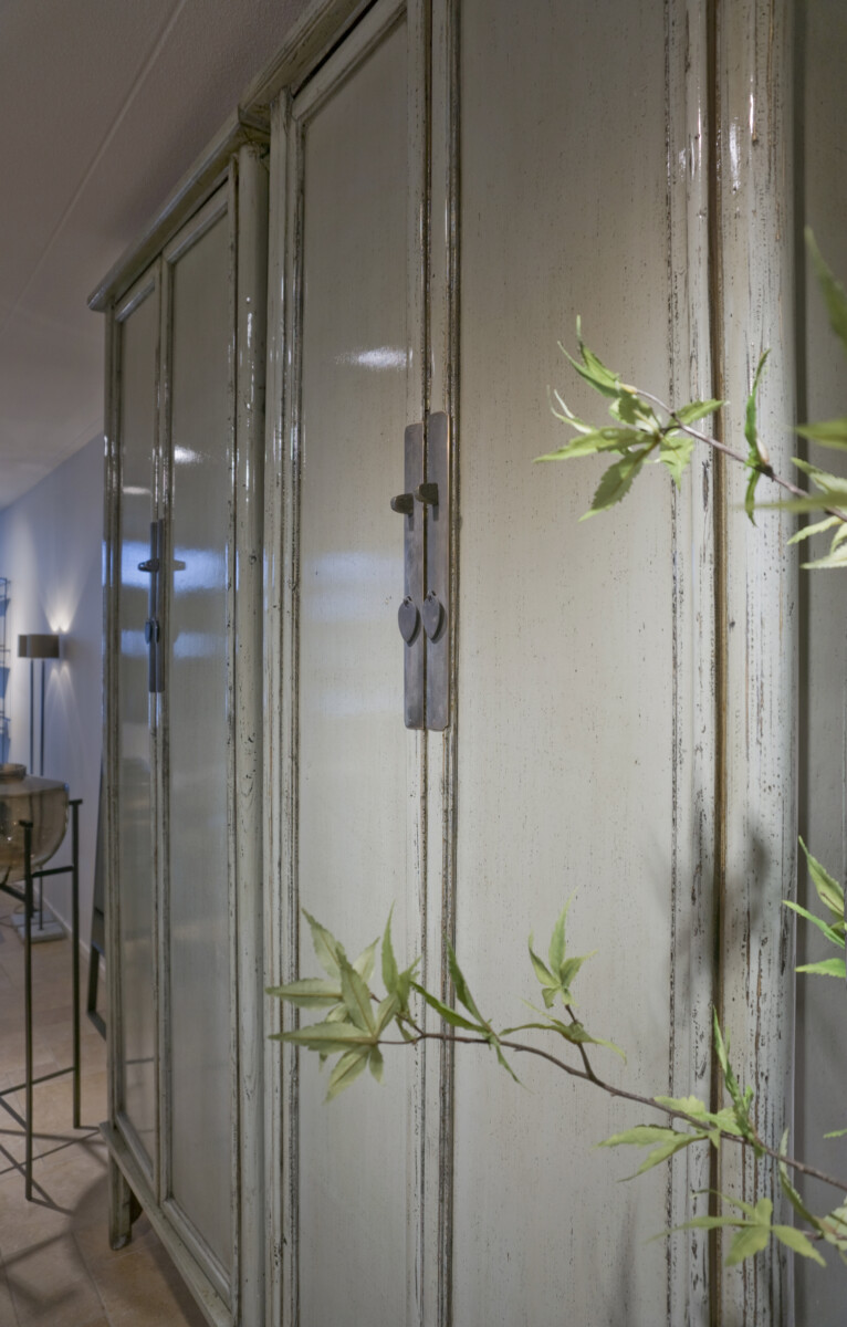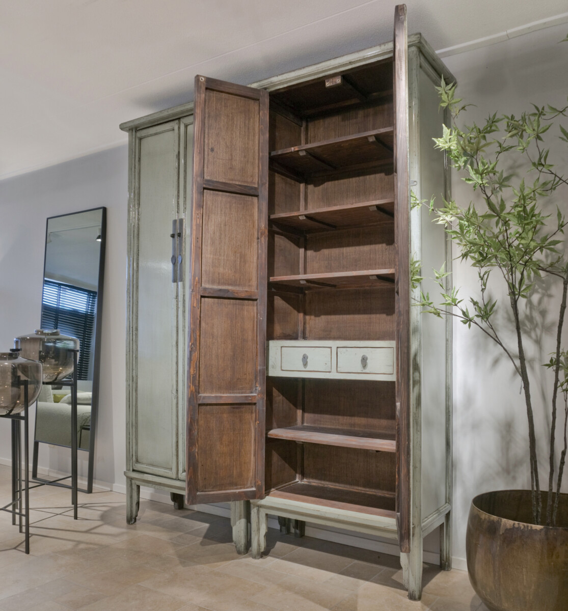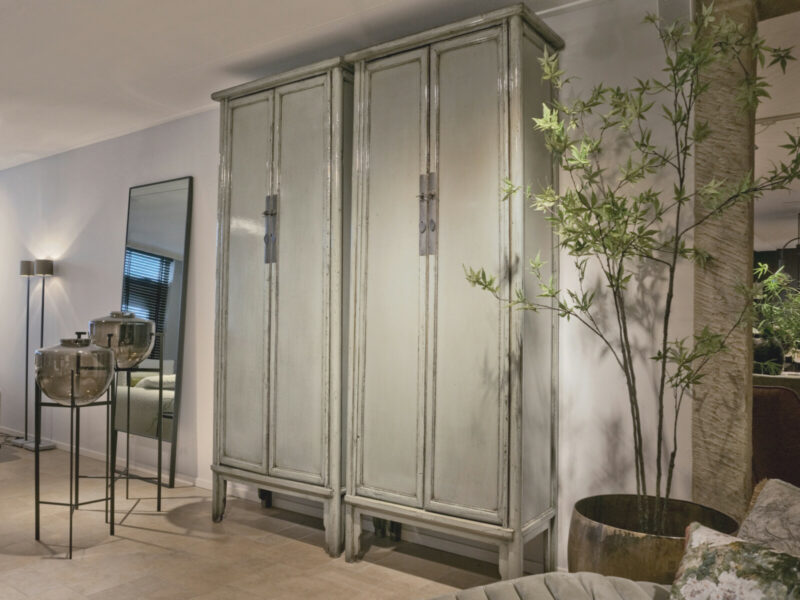 Cabinet Babs 88 ORIENTAL Lacquer Petrol is gemaakt van massief oud grenen met een hoogglans lak in een lichte jade groene kleur, sierlijke poten en ornament beslag van metaal. De kast heeft twee paneeldeuren, zes legplanken, twee binnenlades welke ook zijn gelakt in hoogglans, en het binnenwerk is verder gelakt in een diep bruine tint.