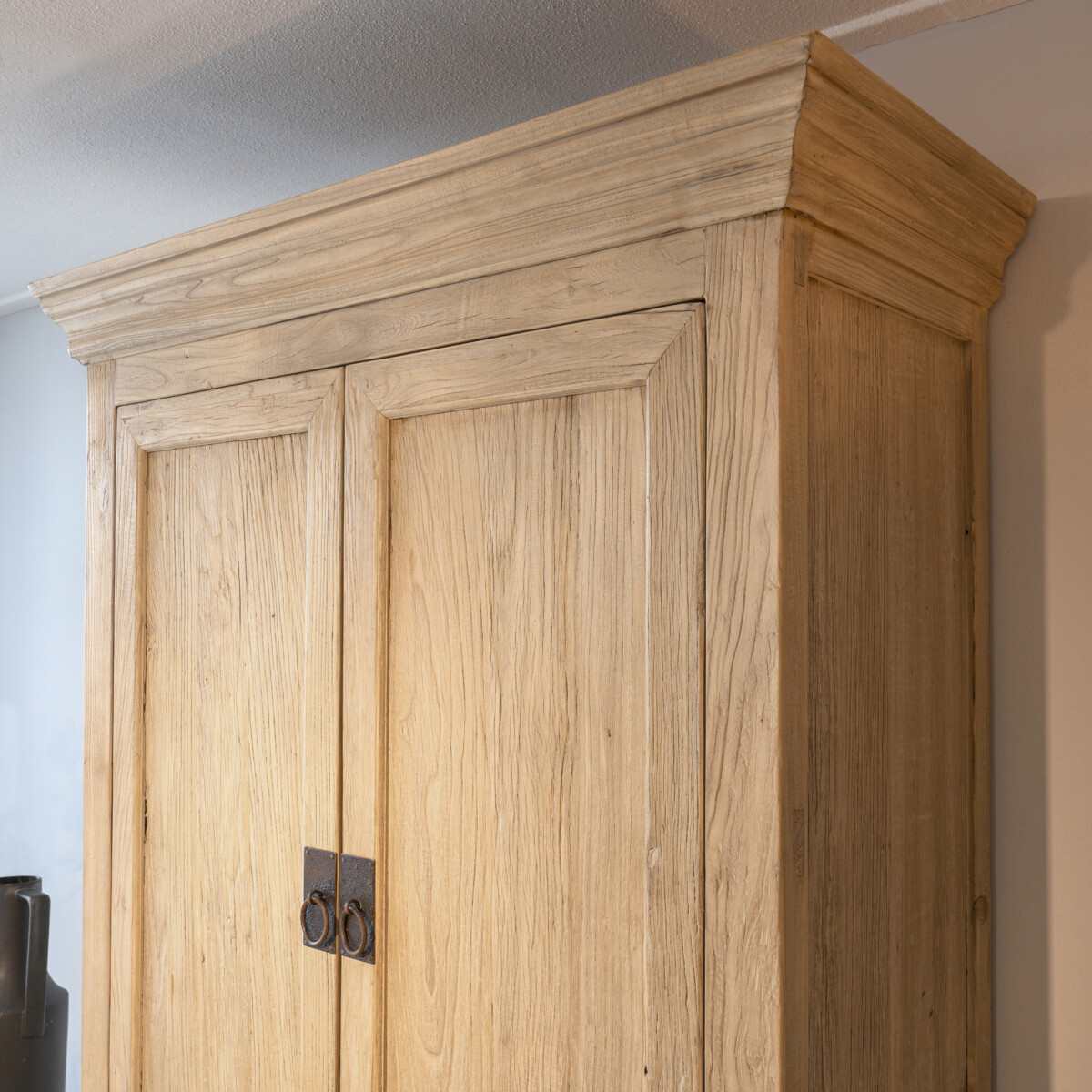 Cabinet Carla 110 CLASSIC Naturel is gemaakt van massief olmen hout met een mooie nerf structuur, staand op een frame van donker grijsbruin staal. De kast heeft een klassieke kaplijst, twee paneel deurenen en drie legplanken.