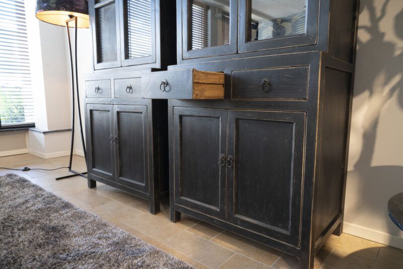 De vitrinekast Mireille 2-deurs small heeft 4 deurtjes, 2 schuiflades en 3 legplanken in de vitrine. Het oppervlak van het hout heeft een mooie voelbare nerf structuur en is artisanaal bewerkt met een donkere beits. Het binnenwerk is handgeschilderd in een lichtgrijze tint.