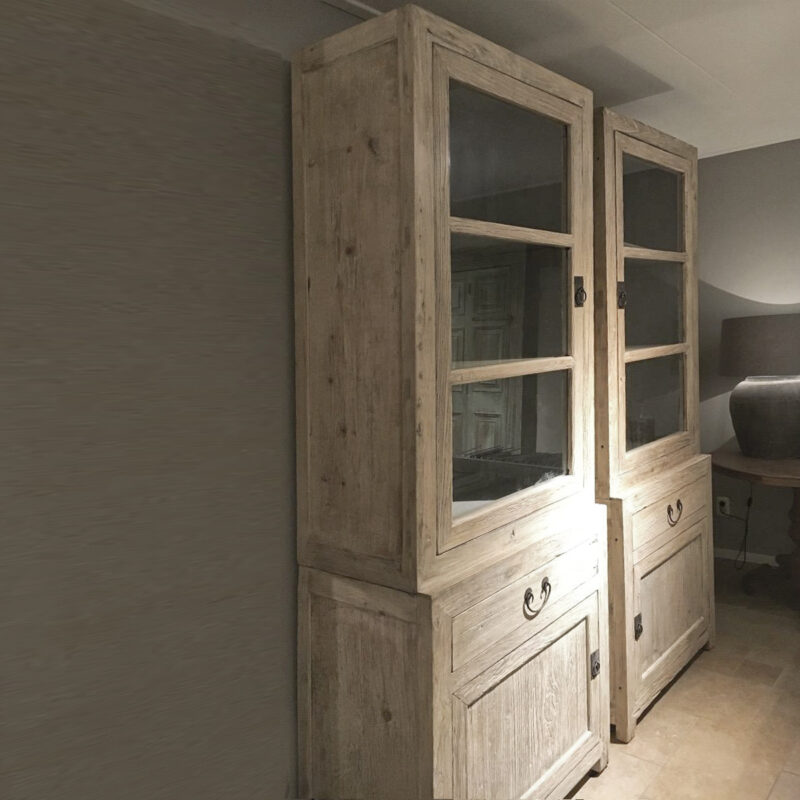 Cabinet Mireille 85 CLASSIC Naturel is gemaakt van massief olmen hout met een mooie nerf structuur. Het binnenwerk is handgeschilderd in een lichtgrijze tint. De kast heeft een vitrine paneeldeur, twee legplanken, een ruime lade, en onder een deur en een legplank.