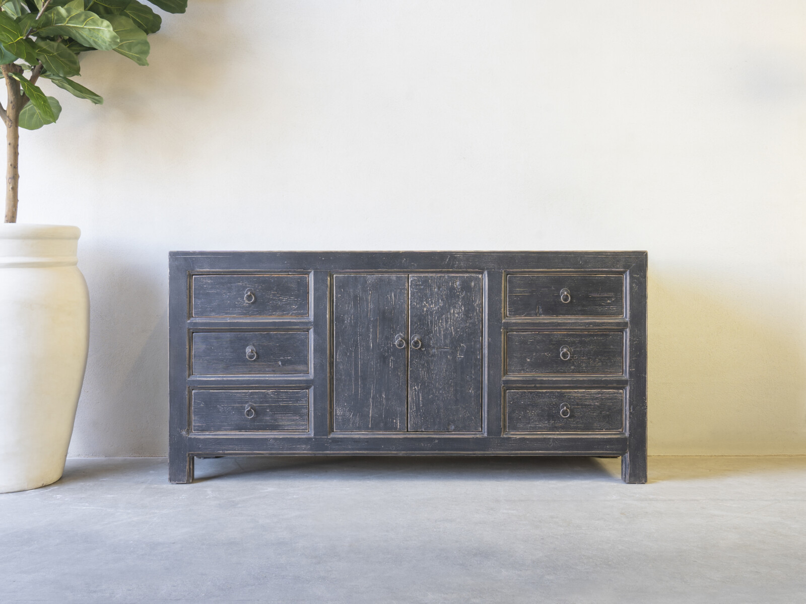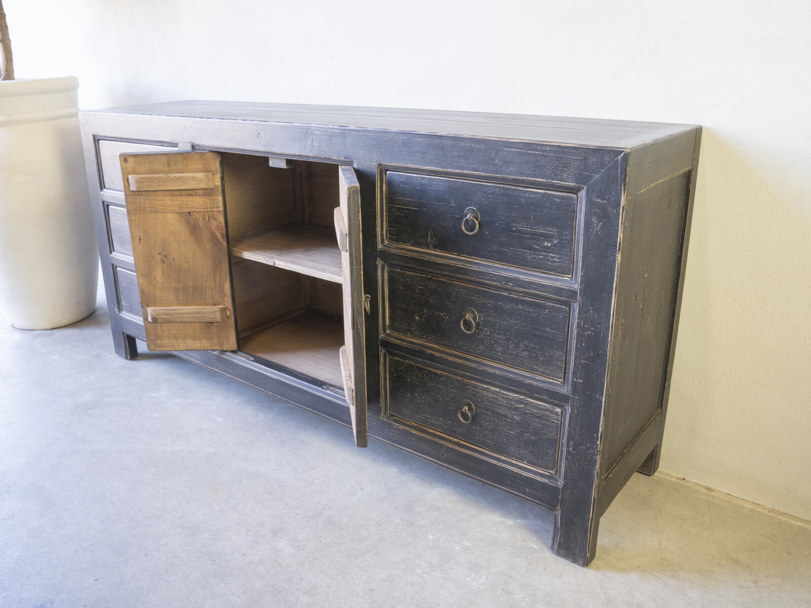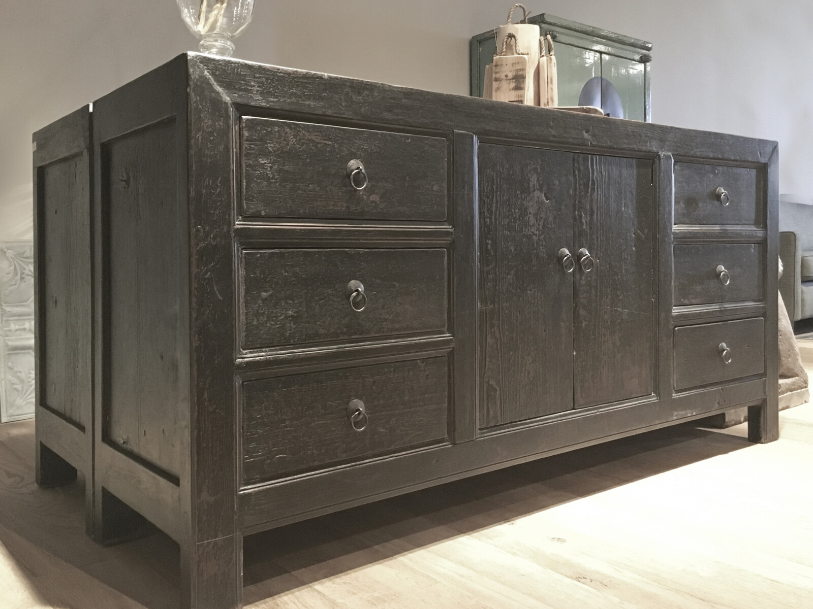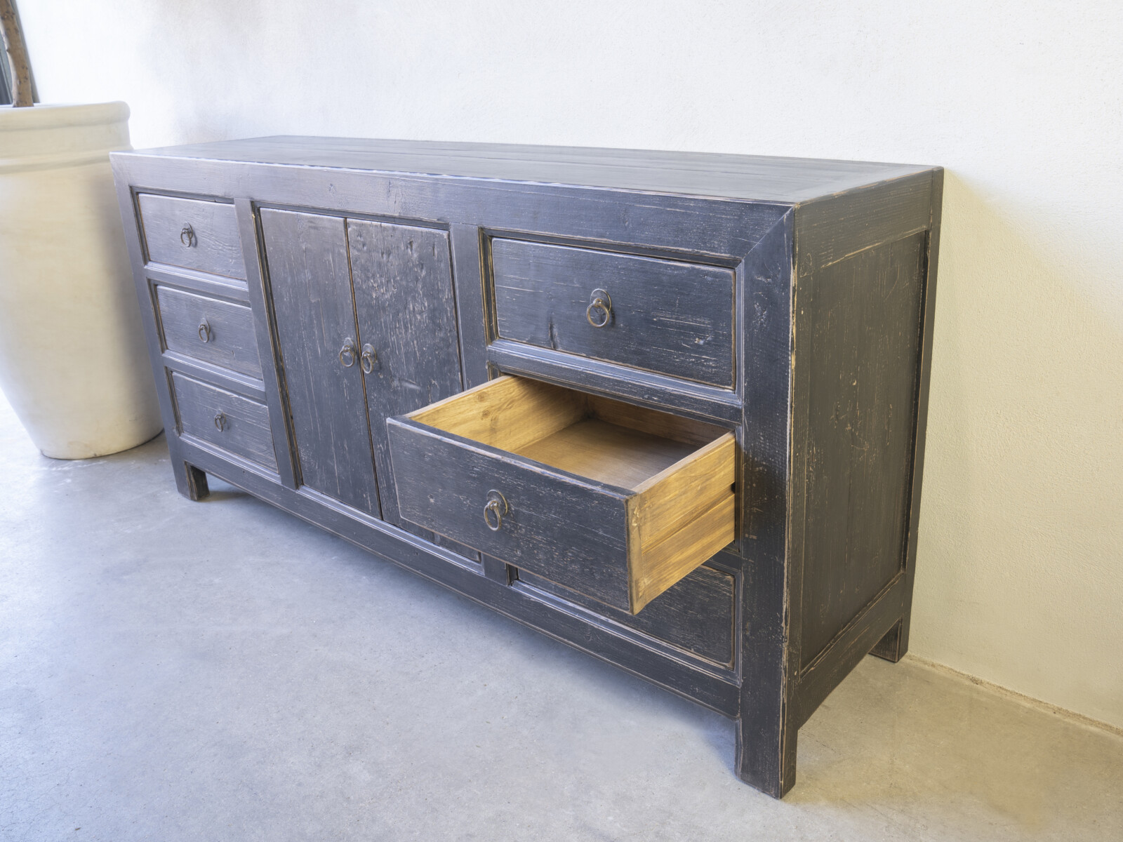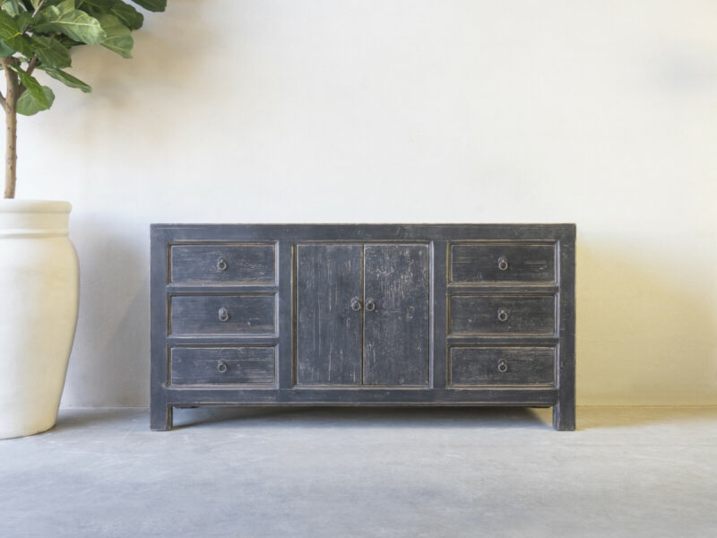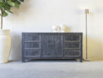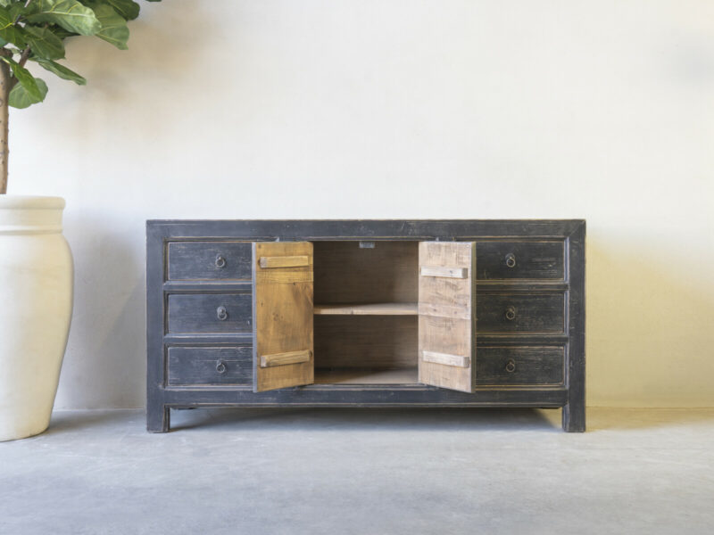 Dressoir Britt 180 CLASSIC Black is gemaakt van massief olmen hout met een mooie nerf structuur. Het dressoir heeft flankerend zes ruime laden, en in het midden twee deuren met een legplank.Er is ook een naturel variant leverbaar: Art. nr. CHC 731 natural –  € 760