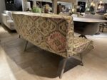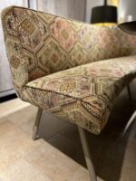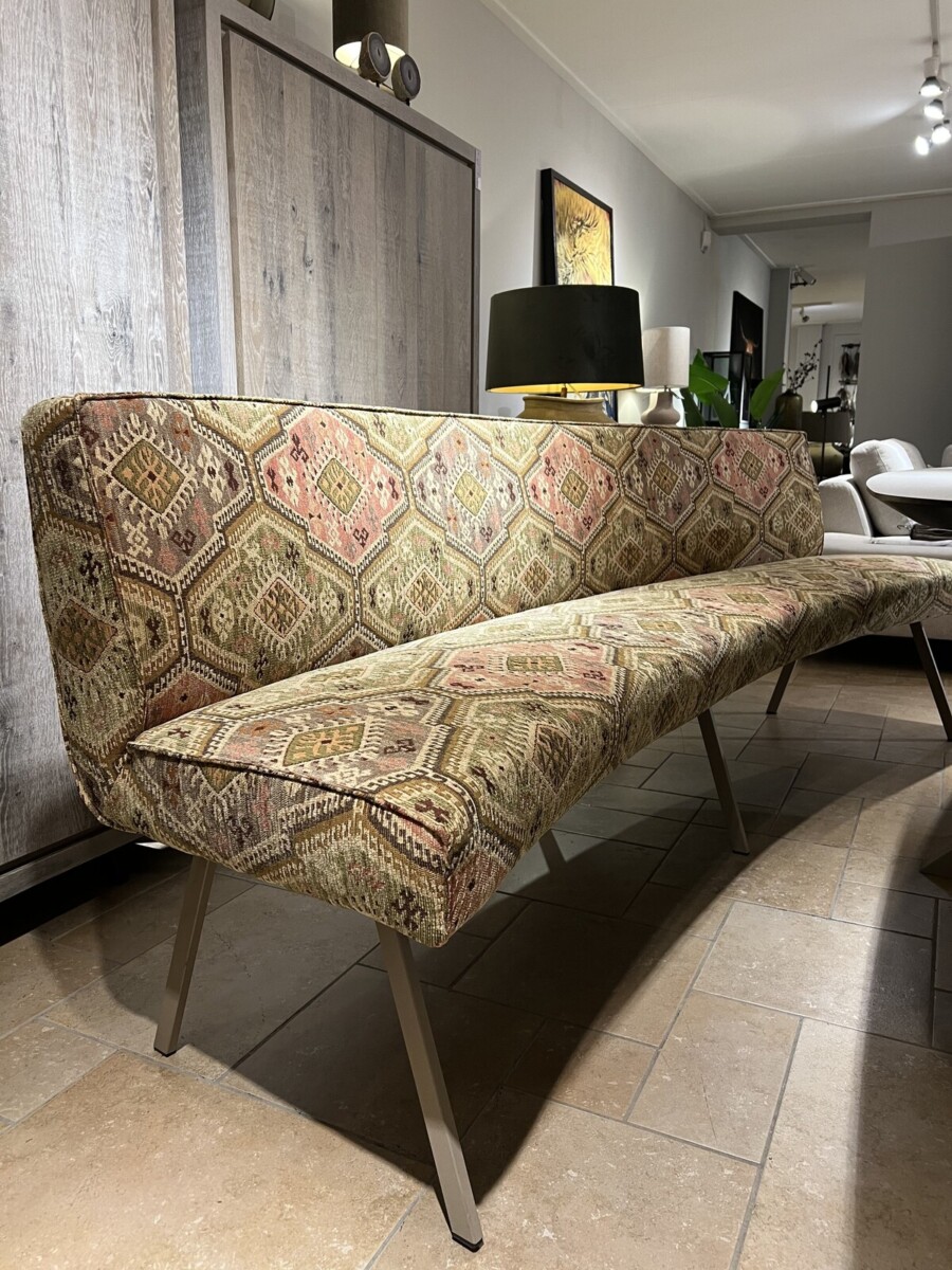 In de showroom uitgevoerd met een jacquard geweven Kelim stof: Kashmar Document (Stofgroep 4), champagne kleurige poten en een breedte van 245 cm à € 2189,00.