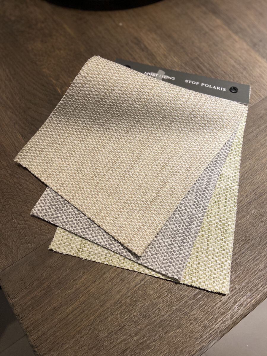Prijs is gebaseerd op de showroom uitvoering met stevig geweven stof Polaris kleur Naturel (82% polyester 18% viscose) en zwarte poot.