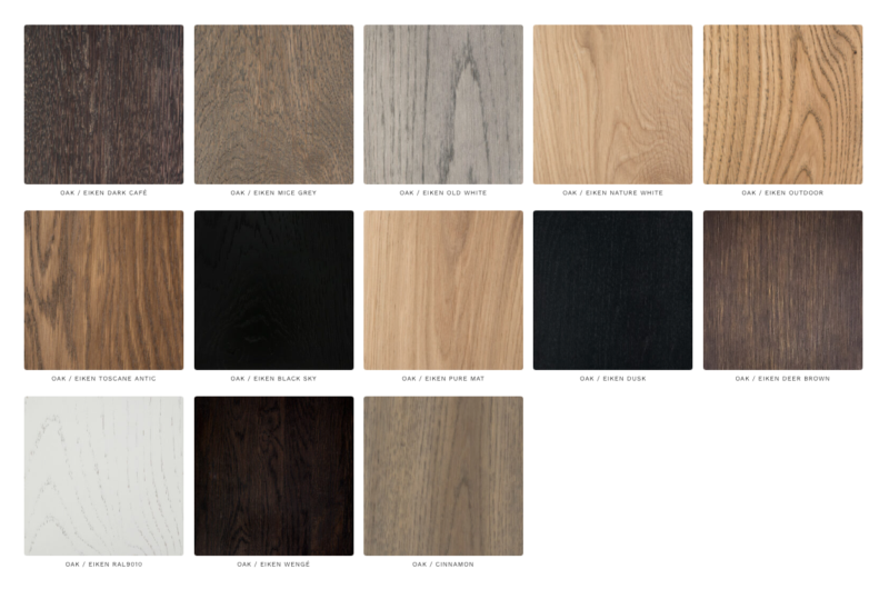 Leverbaar in verschillende hout beitskleuren en in talloze bekledingen: kom naar de showroom om de stalen te bekijken en voelen.