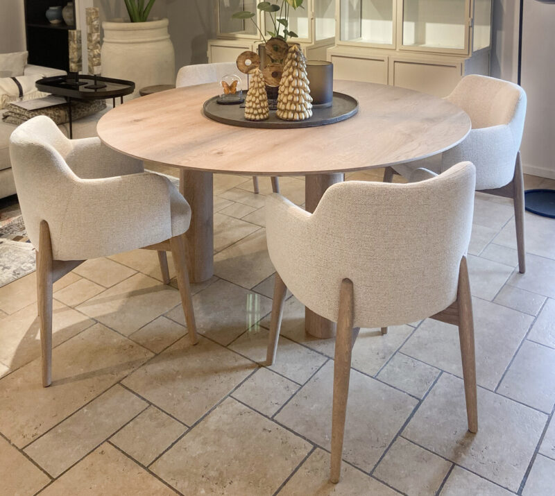 Eigentijds met naturel ‘Japandi look’ met als voordeel: het bijzondere comfort van de gestoffeerde stoelen met armleuning. De prachtige massief eiken poten lopen mooi door in de rug als stylish detail.