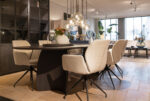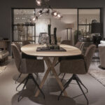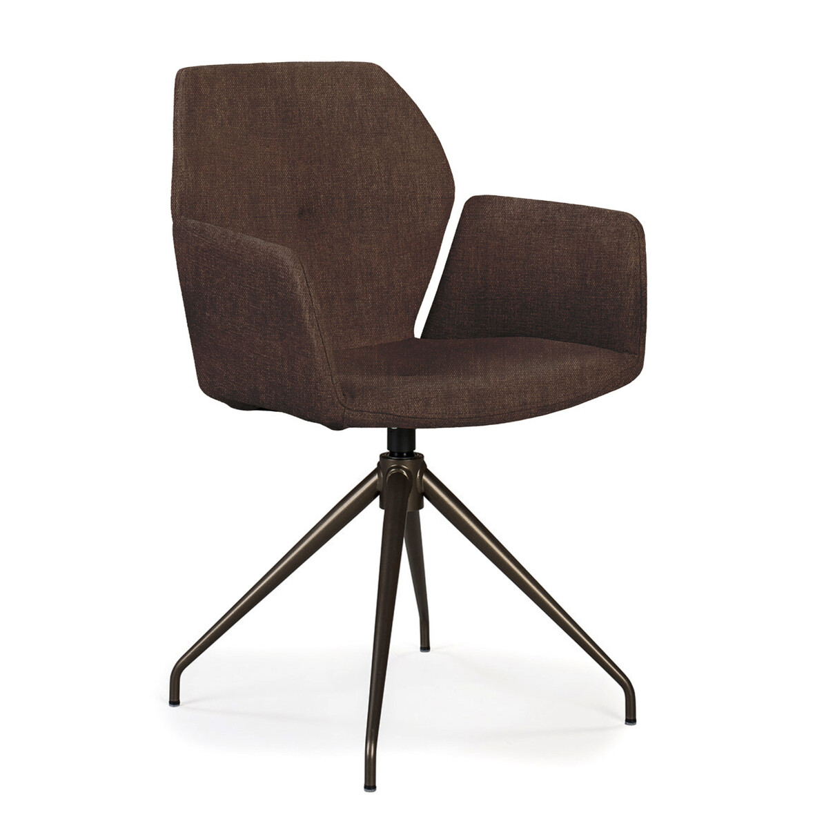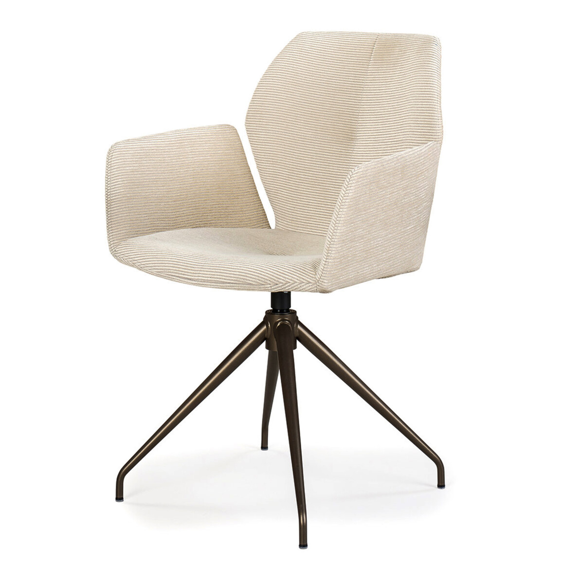 In de showroom, de eerste afbeelding, is de Mood stoel uitgevoerd in model M0712 + A (met armen), met poot: PM 07 (metaal) welke 360 graden draaibaar is. Kleur ppot: PM A01 Black. Gestoffeeerd in CL 4 Berry, kleur Beige 18607. À € 565,00 per stuk.