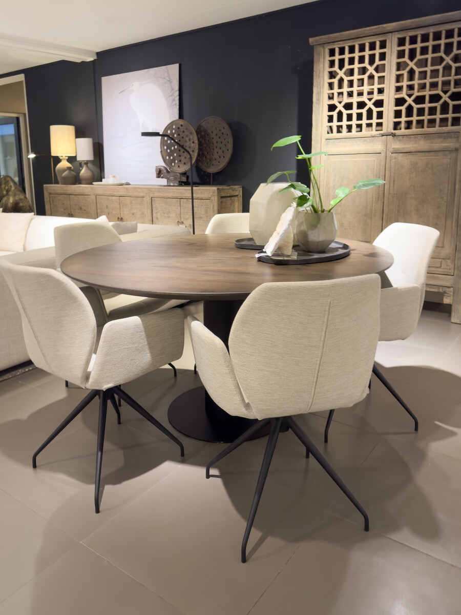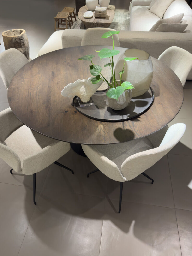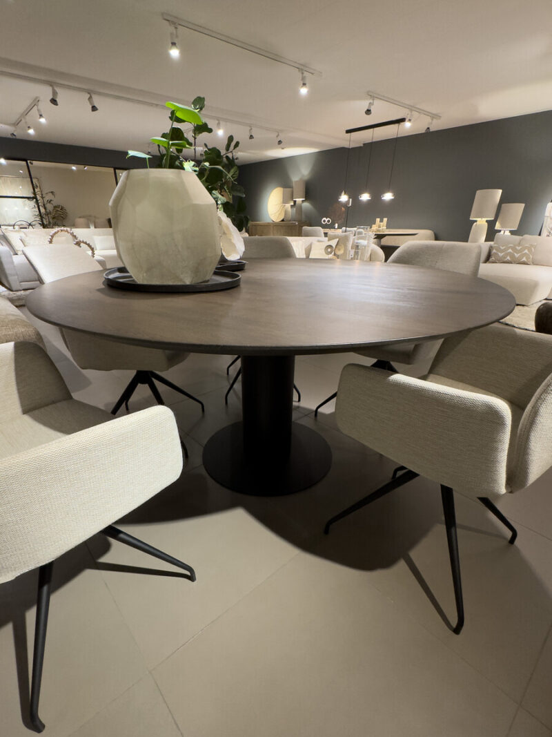 Ronde tafel van massief eiken met verjongd blad. Deze tafel heeft ontzettend veel mogelijkheden in kleur, afwerking en onderstellen om de juiste match te maken met jouw interieur!