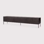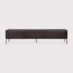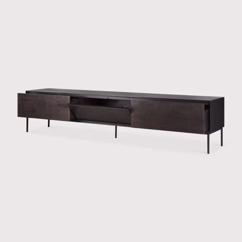 Het Grooves TV-meubel heeft een push-to-open klepdeur en twee push-to-open lades. Gemaakt van donkergekleurd massief teak met een vernis afwerking en een zwart metalen onderstel.